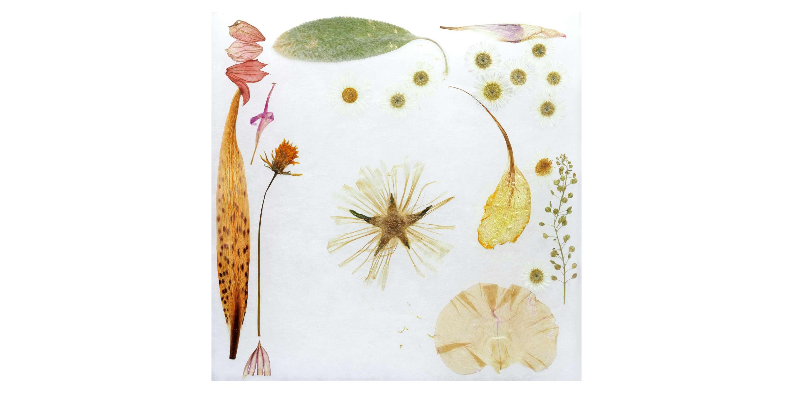 山田は、採取した野生植物や自身で育てた花々が土へと還るまでの移ろいを愛しみ、その日常から生まれる感動を平面や立体、インスタレーションといった多様なスタイルで作品に表現。作品には、自然との対話から紡がれた柔和な視点と、手仕事の痕跡が残されている。
