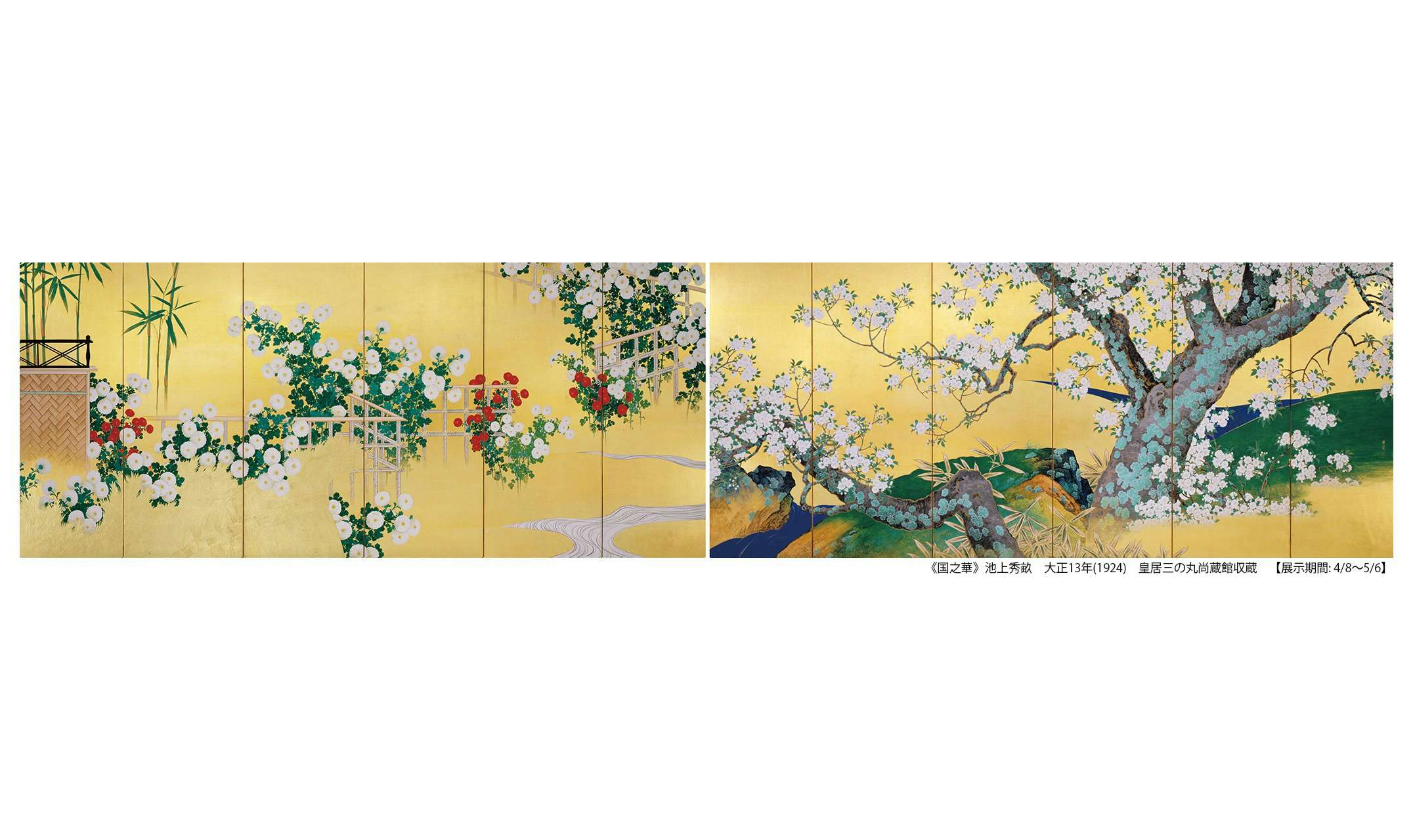 本展では、皇室伝来の貴重な収蔵品のなかから、花を題材とした11世紀から現代にいたる絵画・工芸・書跡45件を紹介する。また伊藤若冲によって制作された国宝《動植綵絵》のうち、花を描いた4幅を公開。前期では《桃花小禽図》と《牡丹小禽図》、後期では《梅花小禽図》と《薔薇小禽図》が展示される。