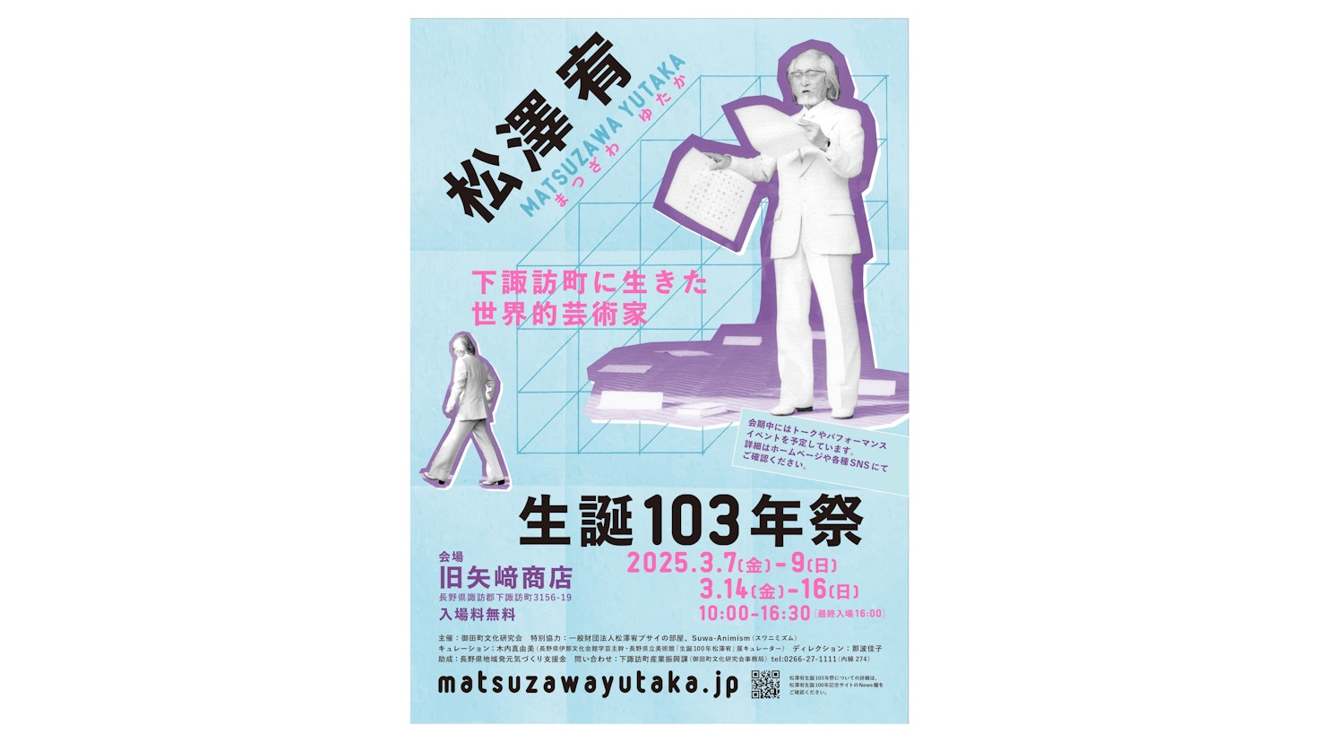 生誕100年を記念して2022年2月に下諏訪町で開催された松澤宥生誕100年祭には、コロナ禍でありながら多くの来場者が参加した。生誕100年祭から3年、松澤が生きた時代の文化を残す歴史的建造物「旧矢﨑商店」の一部を舞台に展覧会を開催。本展では、初期の絵画やオブジェから、後期の言葉やパフォーマンスによる作品の記録映像や関連画像など、未公開作品約10点を含め展示される。