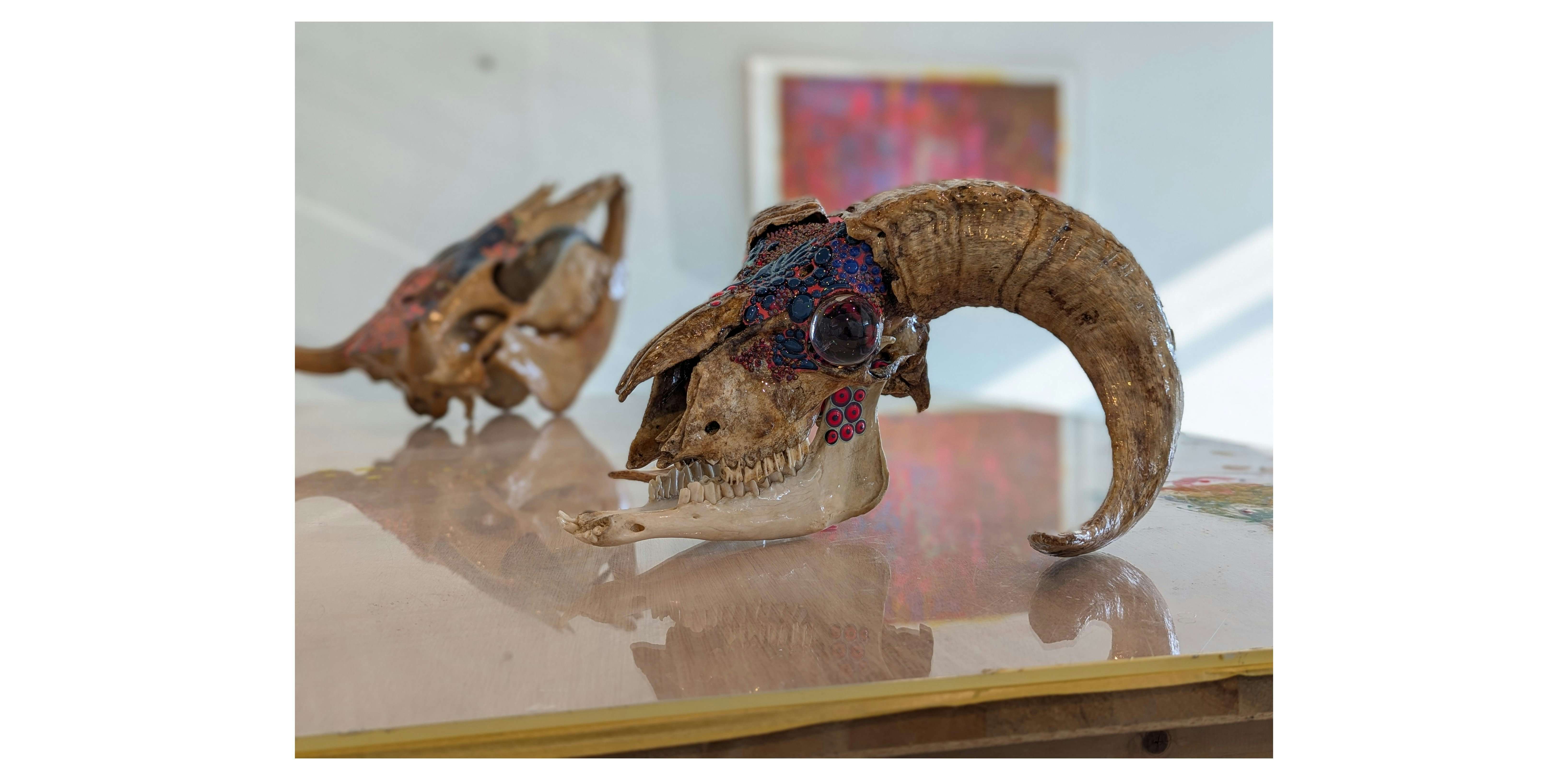 「僕が京都版画トリエンナーレに参加したのが2016年でした。このときに出品した作品が『Hundred Layers of Colors』シリーズです。この作品を制作するときには、インクを刷り重ねながら絵画的な感覚を使用することを意識していました。2019年から制作を始めた『Looprint』シリーズでは、作品は何をもって完成となるのかというテーマを『ただ四角い色面を刷る』行為に絞り、そのー何かーをあぶり出そうとした試みです。その後『次点(D.K.D.K.D.S.d.)』シリーズでは、僕の表現が扱っているのは『点』であることに注目し、絵画的な面にたどり着くわけではない、点の次の可能性を『線』以外に発見することを意識しています。作品をつくるという行為のなかで、自分自身の自作に対する解釈の移り変わりも見えてくればよいかなと思っています。そのほかにも行為自体の物体化を実現した『NEW ENLIGHTENMENT』。頭蓋骨を支持体に、制作時のアイデアを次の作品に反映し転がしていく『Inducer』シリーズなども出品します」(展覧会ウェブサイトより)。