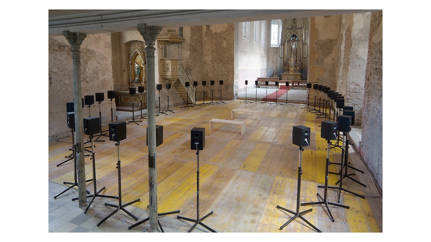 本展の会期序盤には、特別企画としてジャネット・カーディフによるサウンドインスタレーション《40声のモテット》をギャラリーAで期間限定(2025年3月15日〜5月11日)で展示。トマス・タリス(16世紀イングランド王国の作曲家、王室礼拝堂オルガン奏者)作の40声の楽曲を再構成した本作は、2001年の発表以来、世界各地で展示されているカーディフの初期代表作である。楕円形に立ち並ぶ40台のスピーカーの一台一台から一人ひとりの声が聞こえ、徐々に声が重なりあい、歌声を響かせあっているような臨場感のある場へと変化する。
