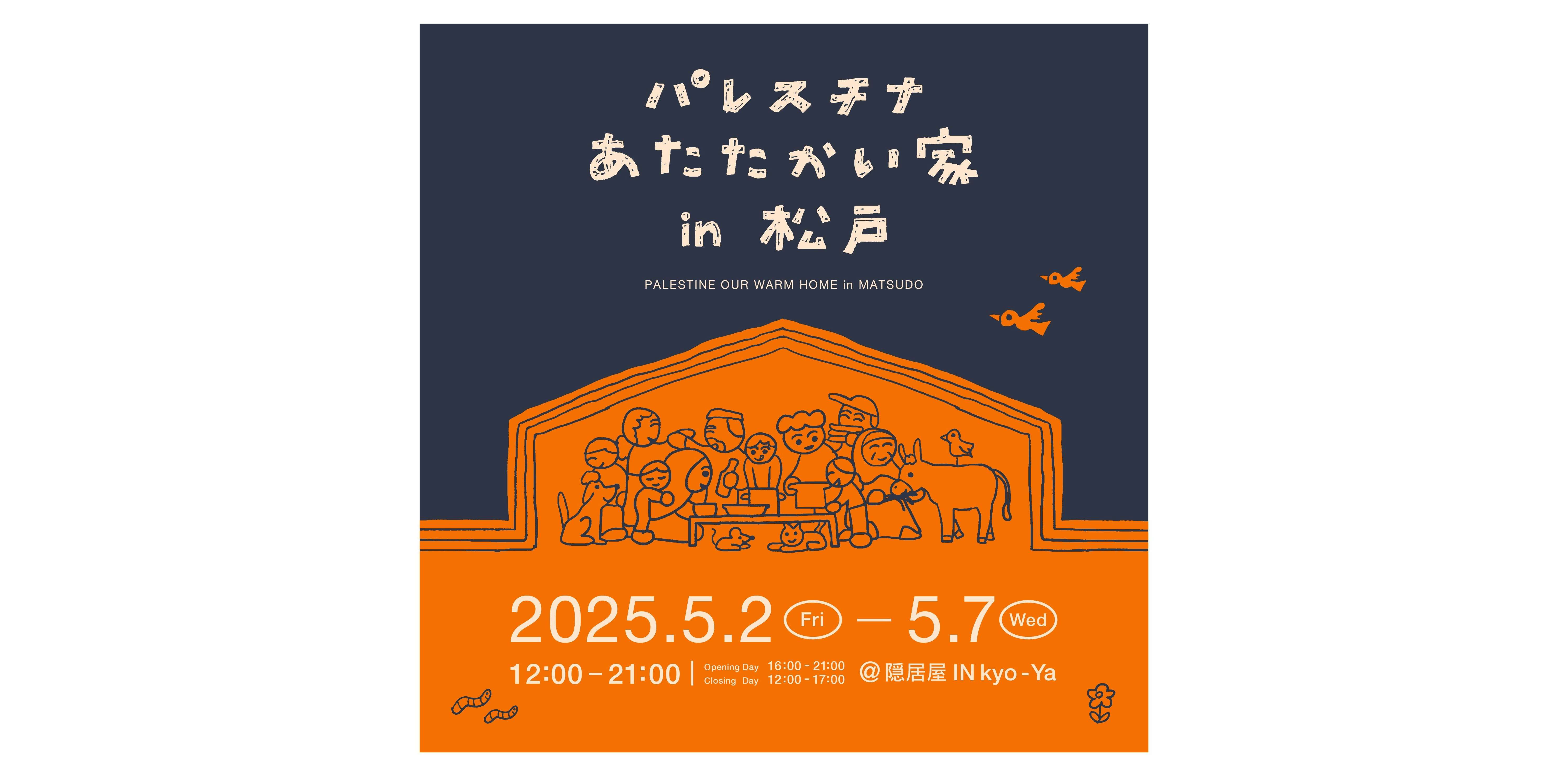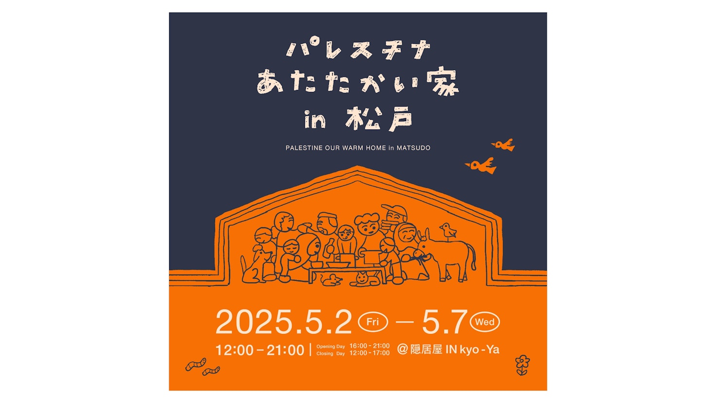「パレスチナの誰もがあたたかい家で幸せに暮らすことを願う市民によるアートの展示会を開催します。作品鑑賞だけでなく、パレスチナについて学び、体験できる展示会です。パレスチナで"70年以上"続くイスラエルによる占領と虐殺植民地主義の暴力が、日本の私たちの生活と地続きであることを自分ごととして、とらえるきっかけとなり、行動を続けるエネルギーを蓄えられる場を目指します。あたたかい家は、暗い闇のなかにぽっと灯る明かりのひとつでありたいと思います。そして、あなたもその明かりになってほしいです」(展覧会ウェブサイトより)。