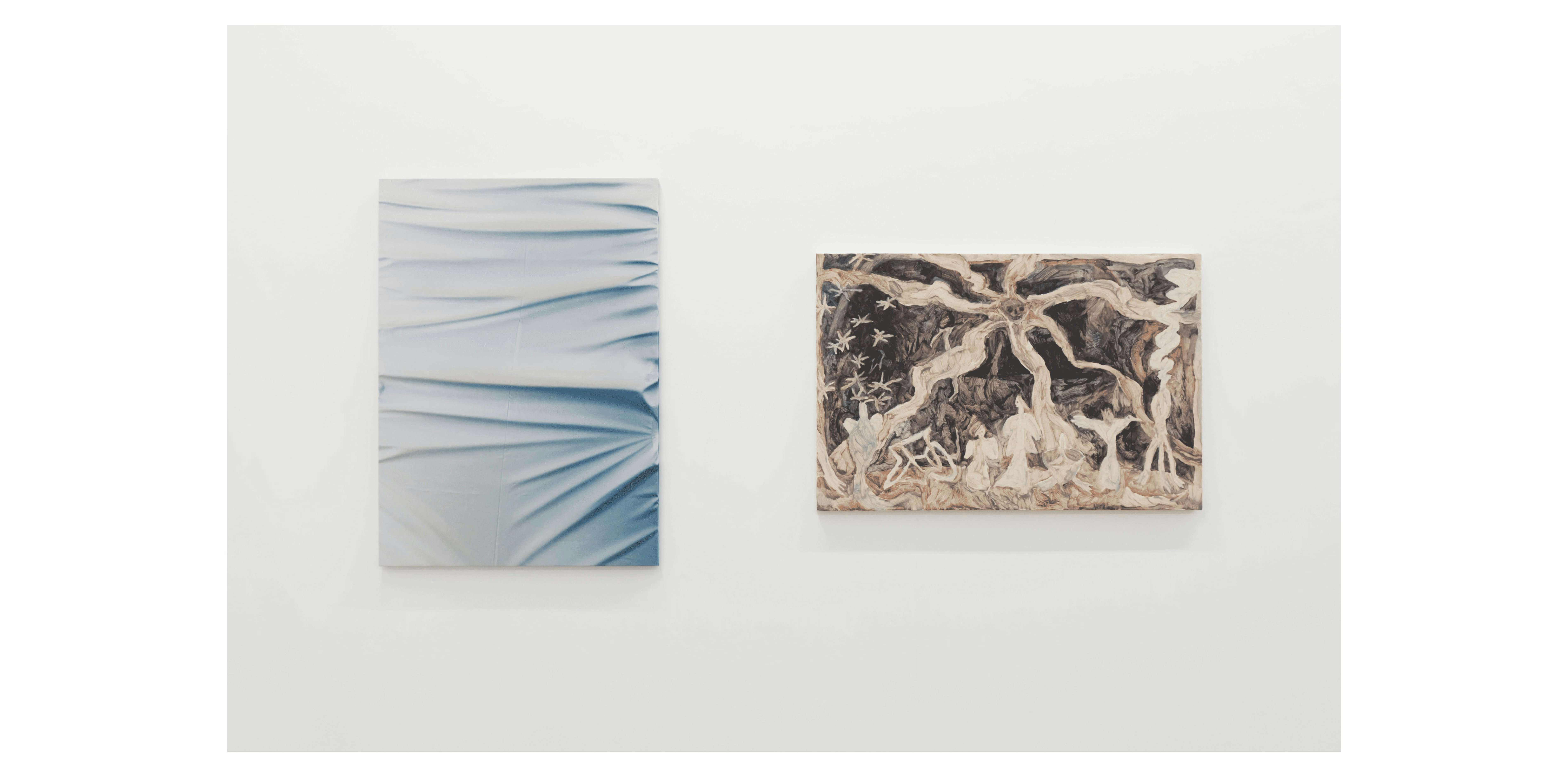 出展作家の木下令子は、布のドレープや紙の皺や折り目にスプレーガンを用いて着彩する作品や、日常にある光で印画紙を感光させて色彩を生み出す作品などを制作。素材の性質によって制作されるそれらの作品は、木下が選択する素材の特性と時間の経過を明らかにする。中田さつきは、武蔵野美術大学油絵学科を卒業後、2018年に同大学院を修了。隣人の死に感じた死のリアリティをもとに作品を描き続けている中田は、死と向きあう人物や動物、主人が死んだ後に残され育ち続ける植物の様子などを幻想的かつ内省的に描き出す。