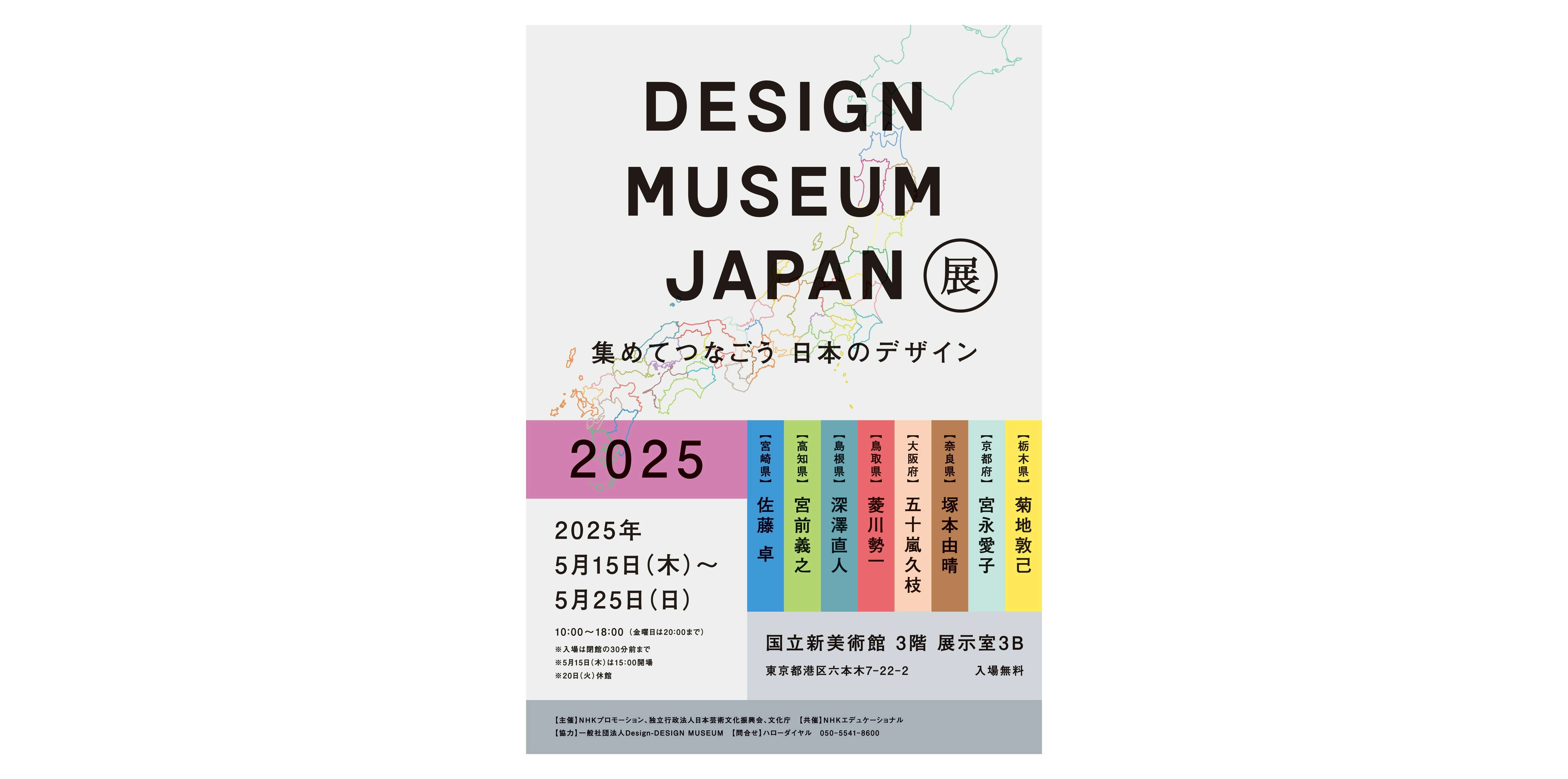 本展は、NHKで放送されてきた「デザインミュージアムジャパン」と歩調をあわせ、展示を通じて地域の魅力を発信し、日本全体にひとつの「デザインミュージアム」を浮かび上がらせようとする取り組みである。日本中の多くの人に「デザイン」は、じつは私たちのまわりに溢れていて、日々の暮らしに豊かさや活力を与えていることに気づいてもらうこと、そして、いまはまだ存在しない日本の「デザインミュージアム」の姿についての、ひとつの提案になることを目指す。