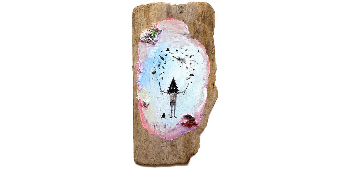 頭部が植物になった人物をモチーフに、想像力豊かな絵画シリーズを手がける平子雄一。植物に代表される自然と、人間の営みや人工物を同列に描くことで自然と人工の境目を曖昧にし、様々な象徴的モチーフを巧みに配置した画面はときに悪魔的な力を秘めた黙示録的な様相を、ときに滑稽な雰囲気を醸し出している。