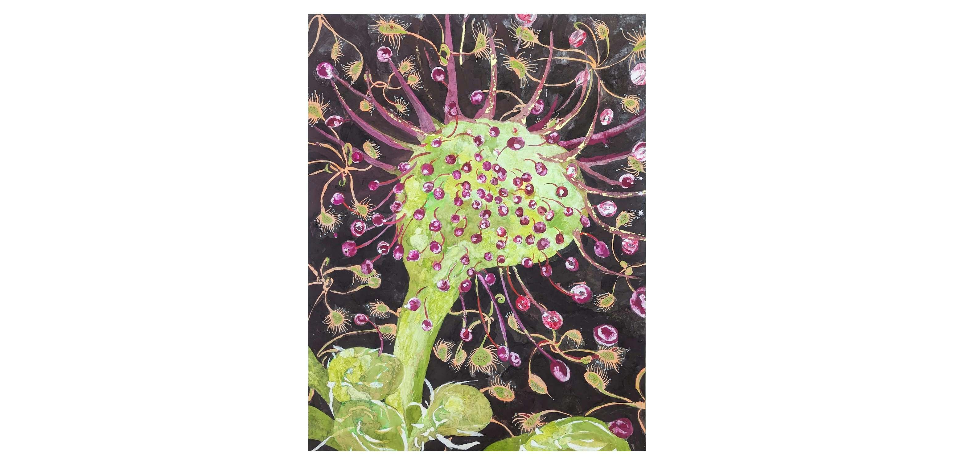 浅野友理子は1990年生まれ。土地の食文化や植物の利用法を学ぶために様々な土地を訪ね、出会った人々とのやりとりや自身の体験をなぞり、その土地で受け継がれてきたものを記録するように絵画を制作してきた。それらの作品は、たんなる植物画にとどまらず、土地に伝わる知恵や知識に着目し、現代社会で失われつつある人と自然との共生や、人間以外の生き物に対する視点、生命の循環、あるいは女性の労働など、現代的な問題意識を内包している。