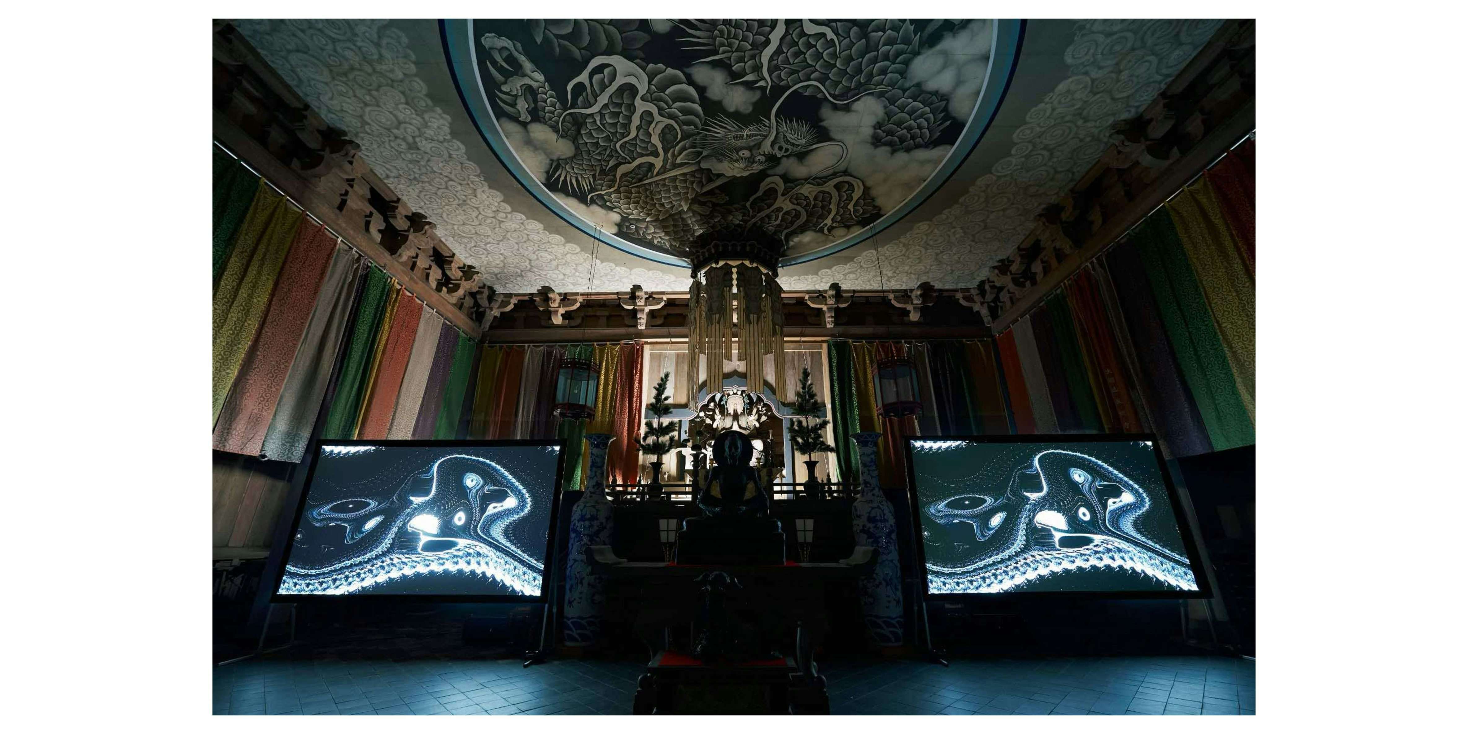 この小泉の天井画に対して「かさね」「うつし」「なぞらえ」といった日本古来の美意識をもって現代的な解釈と継承を試みたのが、アーティストの脇田玲だ。脇田は慶應義塾大学教授として、非線形物理システムや流体力学のシミュレーションのソフトウェア開発に取り組む研究者でもある。建仁寺《双龍図》に応答する前作《龍雨図》(2024年)に続き、サイエンスとアートを交差するオーディオビジュアルインスタレーション《龍雲図》を手がけた。本作は、仏法の雨を降らせるという龍への精神性になぞらえながら、雨や風、雲の動きといった自然現象を、光と粒子によって複層的にシミュレーションし、現代の日本画として表現したものである。