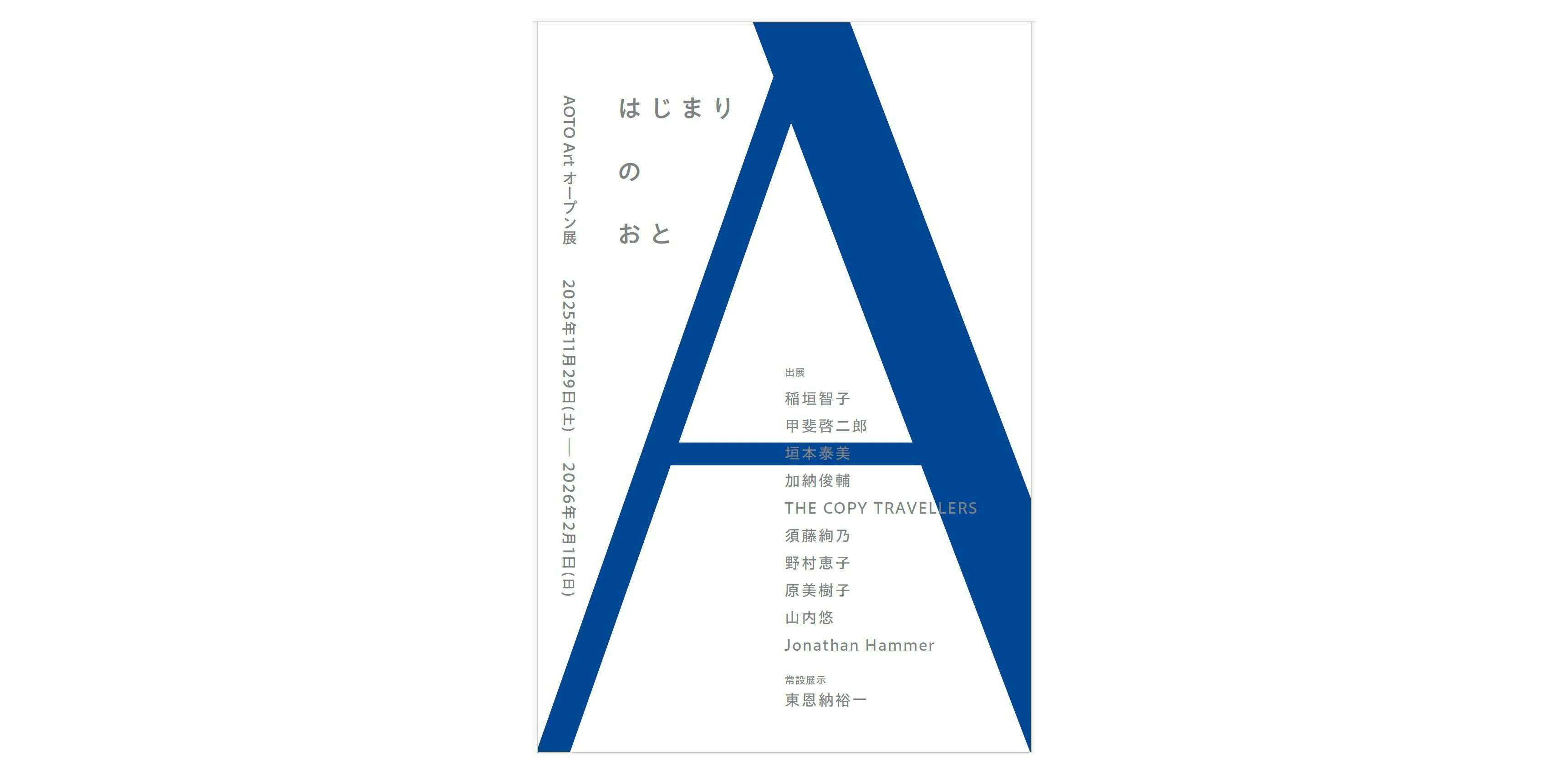 本展は、AOTO Artのオープンにあわせて開催している初の展覧会。「あおと」という名称に込められた、「あ」という音、すなわち「はじまり」を示す響きを背景に、美術家・稲垣智子と丸川コレクションが関わる展覧会として構成される。