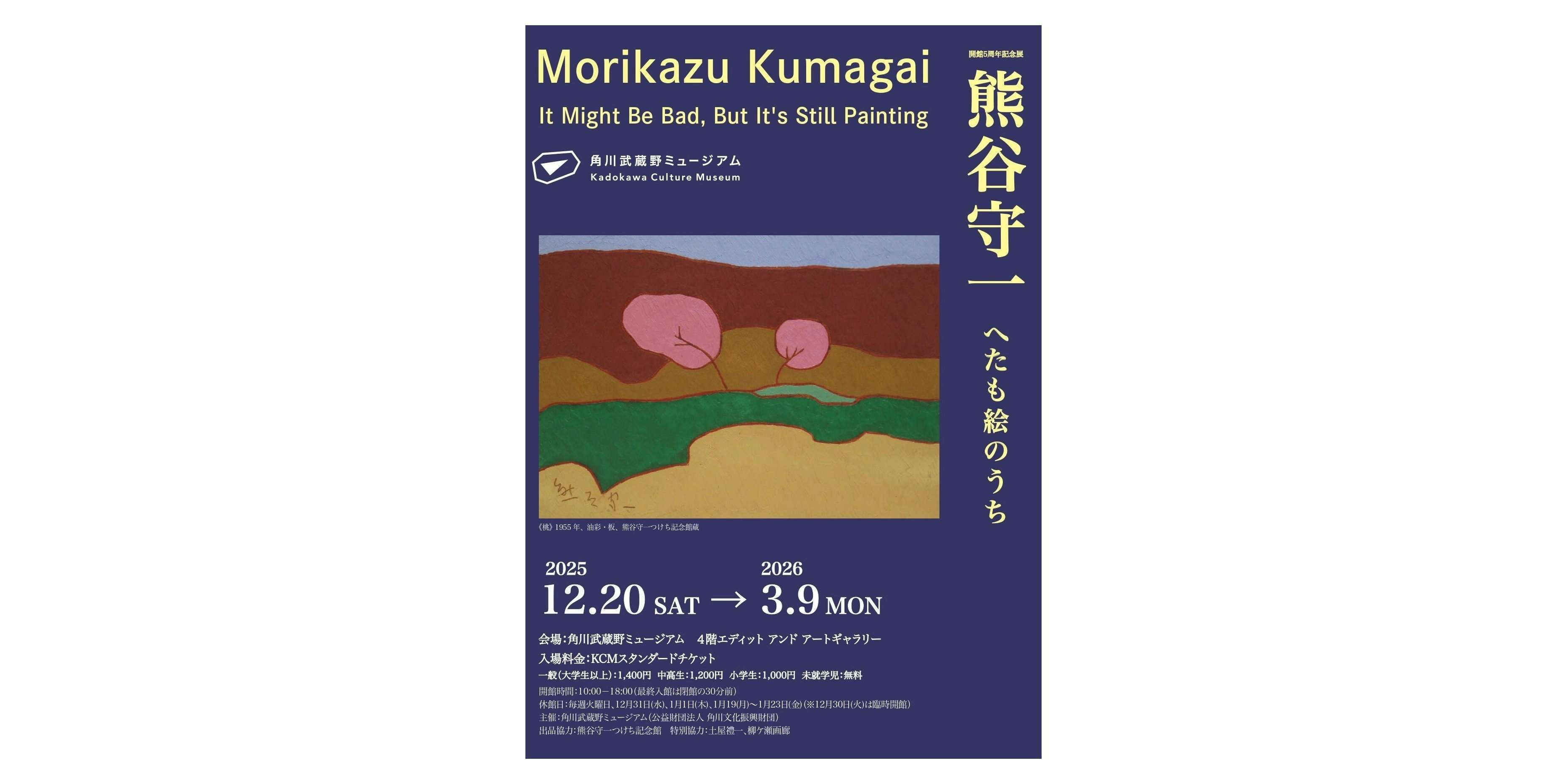 本展は、角川武蔵野ミュージアムの開館5周年を記念して開催されている企画展である。展示室では、モリカズ様式とそこに至るまでの油彩画をはじめ、日本画や書作品を展示している。「西行の日」「ほとけさま」「無一物」などの書を含め、熊谷の絵画と書の双方を紹介する構成となっている。