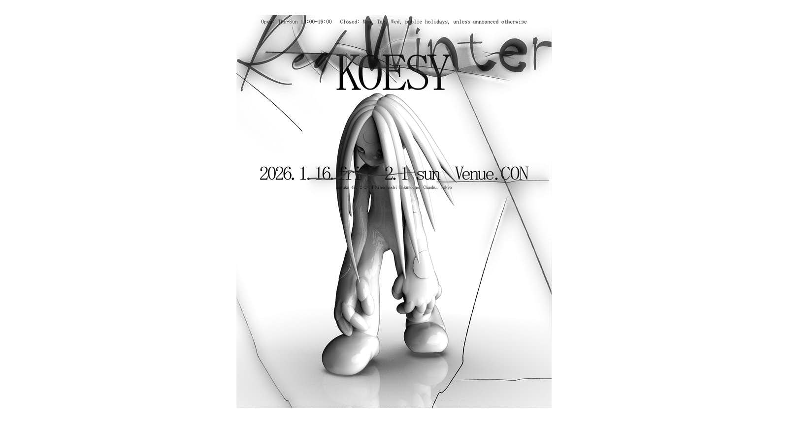 本展では、仮想空間から物理的な造形へと展開してきたKOESYの制作姿勢にもとづく作品を展示する。制作においてKOESYは、明確な意味や物語を設定することを避け「つくること」そのものと、制作の過程を通じて生じる形態に注目。本展タイトル「Red Winter」は、季節とは切り離された個人的な時間感覚に由来し、その感覚を造形として表す試みとして位置づけられている。