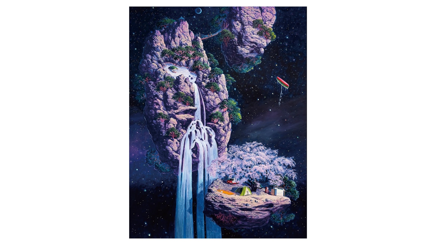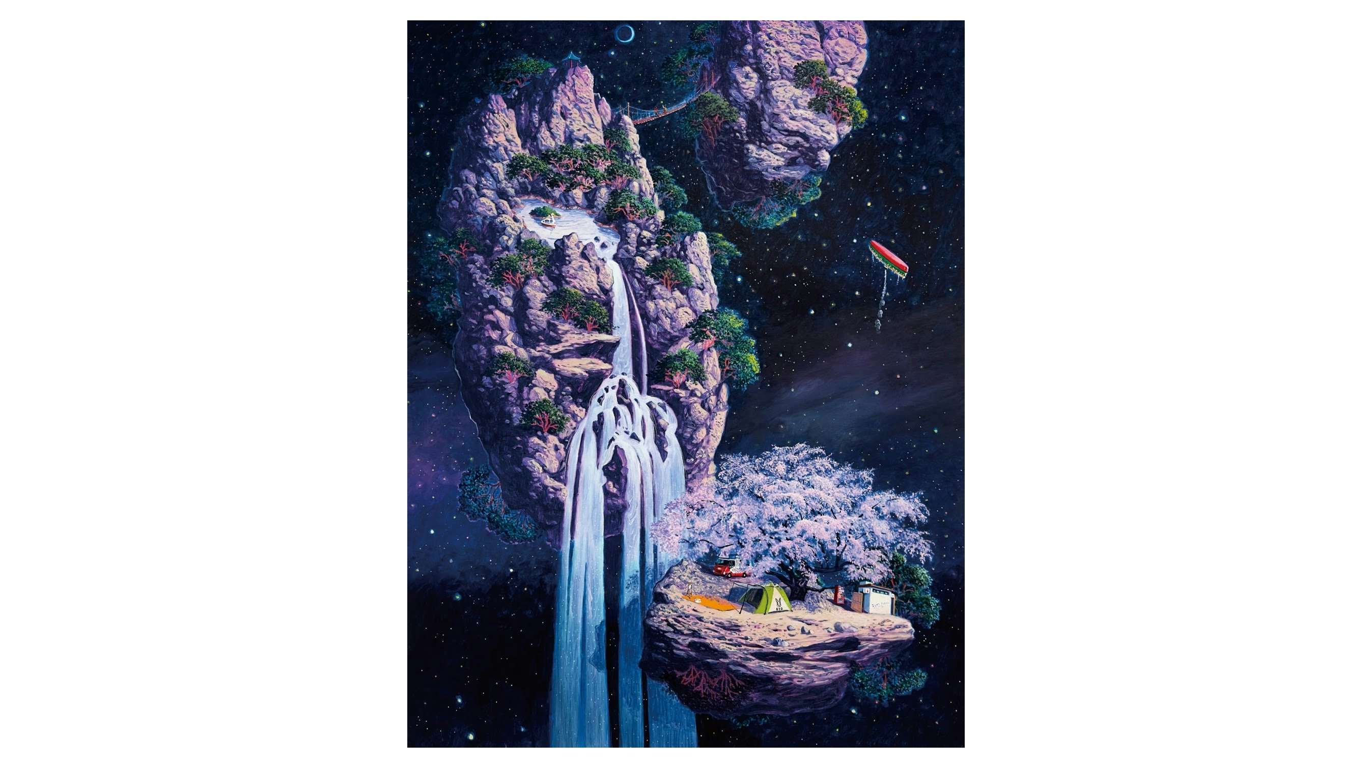作品には中国を起点とする山水画の伝統や、東洋的遠近法である「三遠法」を用いた構成を取り入れている。新作《The Space Sakura with the Infinity Falls(宇宙の桜と永遠の滝)》や、北斎の《冨嶽三十六景 神奈川沖浪裏》をオマージュした《The Rocky Wave and The Galaxy Fireworks》を展示。《Along the Path of the Full Moon》では、地球と月を結ぶ航路を、スターフェリーが岩山を曳きながら進む様子を描く。