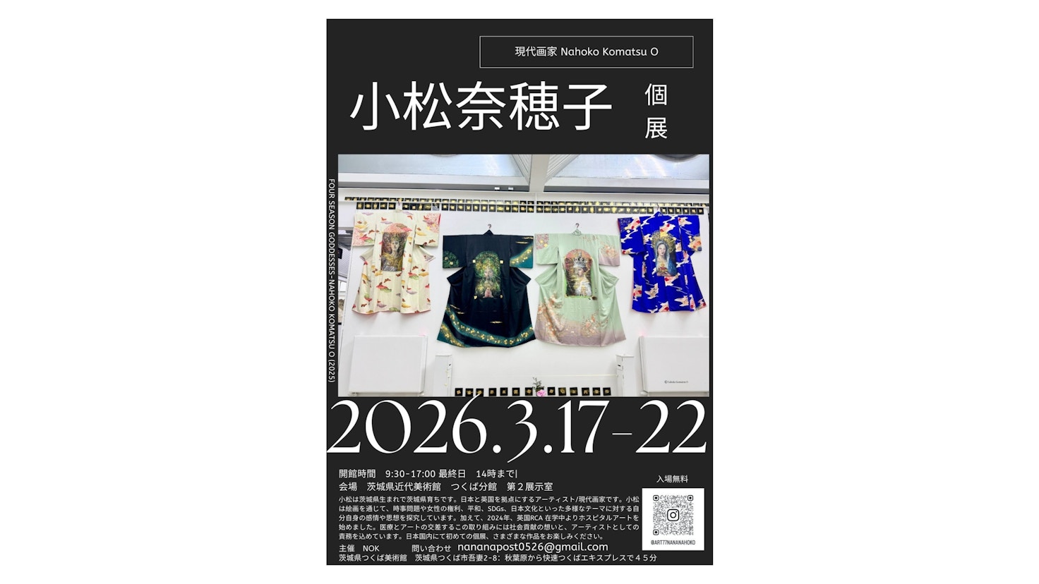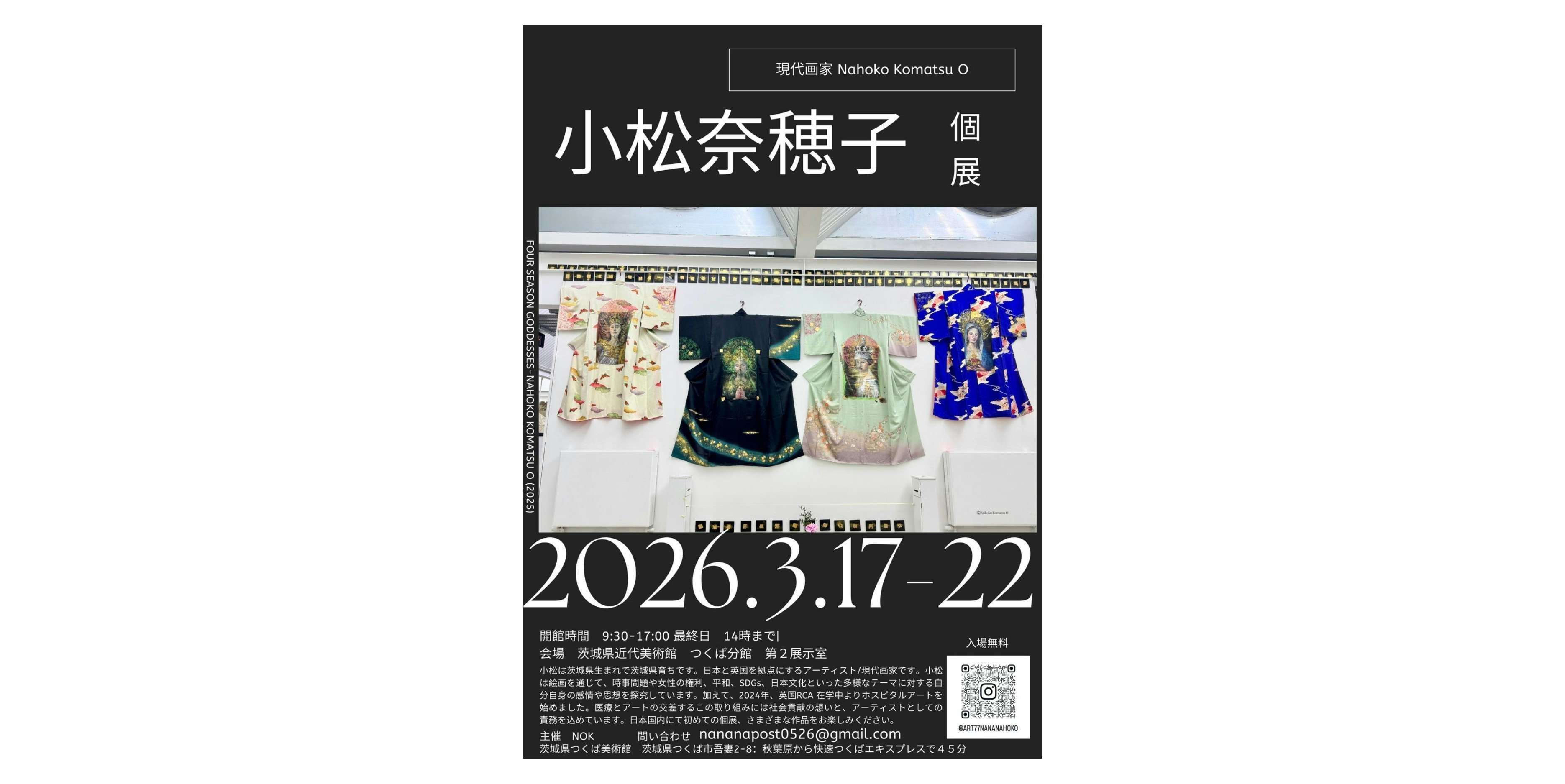 小松奈穂子は茨城県出身。日本と英国を拠点に活動するアーティストだ。国内で初の個展となる本展では、絵画作品を通じて、時事問題や女性の権利、平和、SDGs、日本文化といった多様なテーマに対する自身の感情や思想を研究してきた実践に着目。あわせて、2024年にロイヤル・カレッジ・オブ・アート在学中より始めたホスピタルアート作品も展示する。