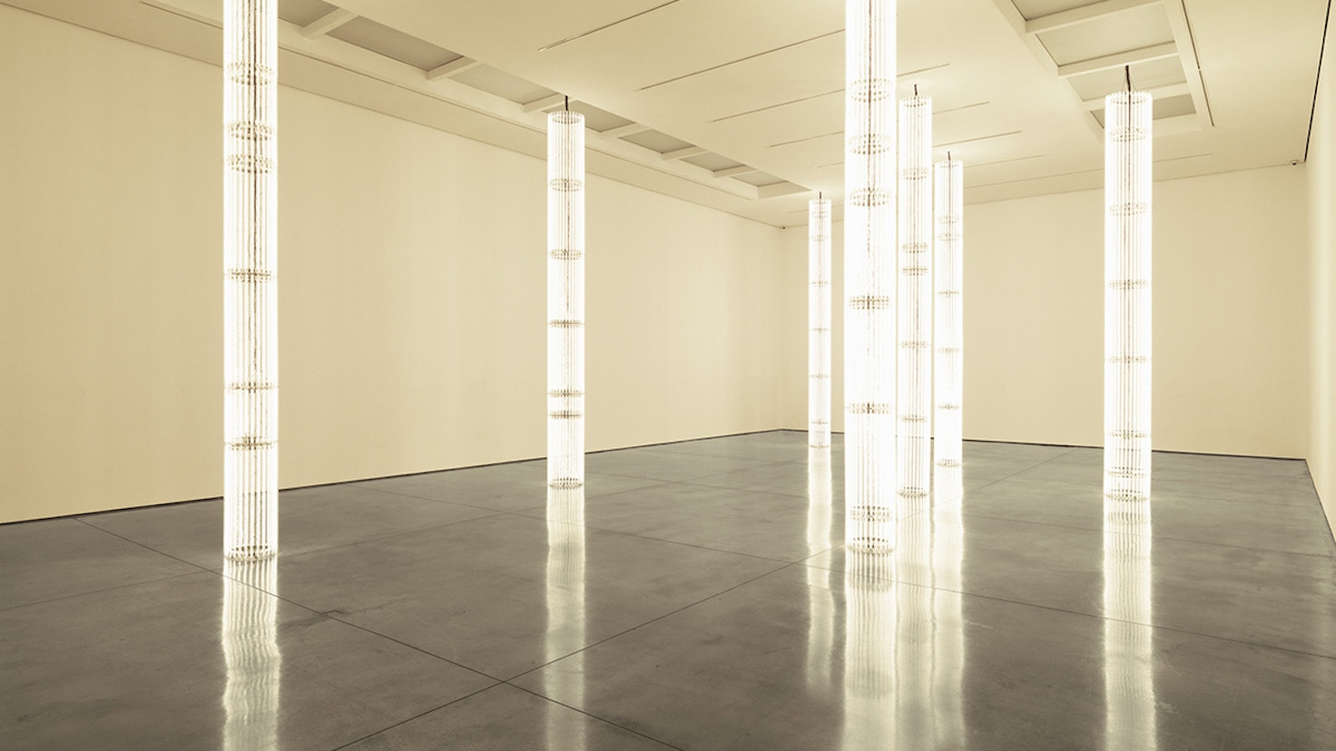 本展では、イサム・ノグチ作の石庭「天国」を舞台に、床面から天井まで達する大規模なインスタレーションを発表。表面をフィラメント電球で覆った光の柱の作品は石庭の音色を浮かび上がらせるテンポを生み、また能舞台にならい石庭の適所に配される松の木は、その有機体としての存在から時間の「質感」を喚起する。