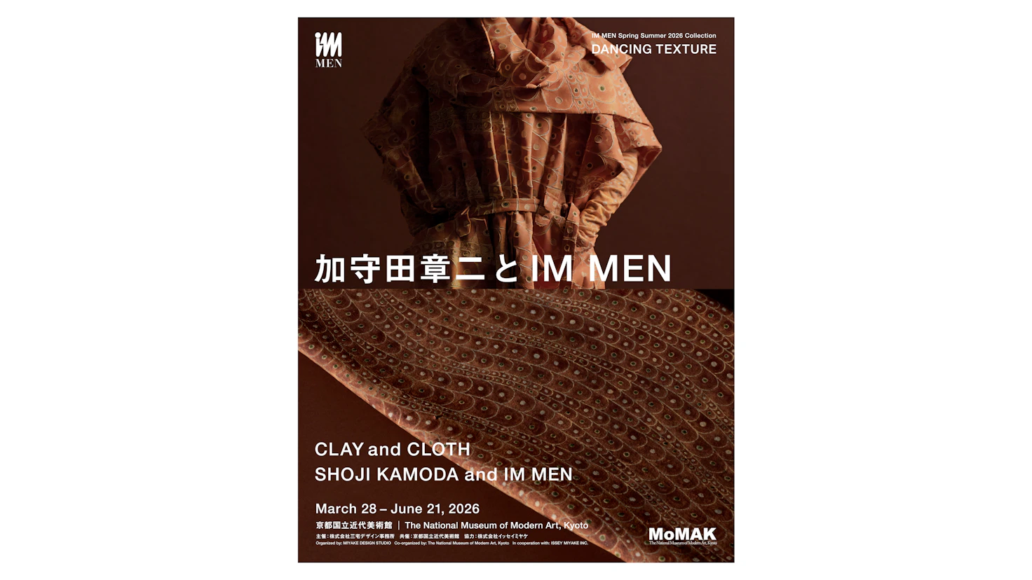 本展では、IM MEN 2026年春夏コレクション「DANCING TEXTURE」を象徴するオリジナルテキスタイルでつくられたピースとともに、京都国立近代美術館所蔵の加守田章二作品を合わせて展示。また、加守田章二ゆかりの土地や人々の記憶、IM MENコレクション制作の工程を記録した映像作品も上映する。