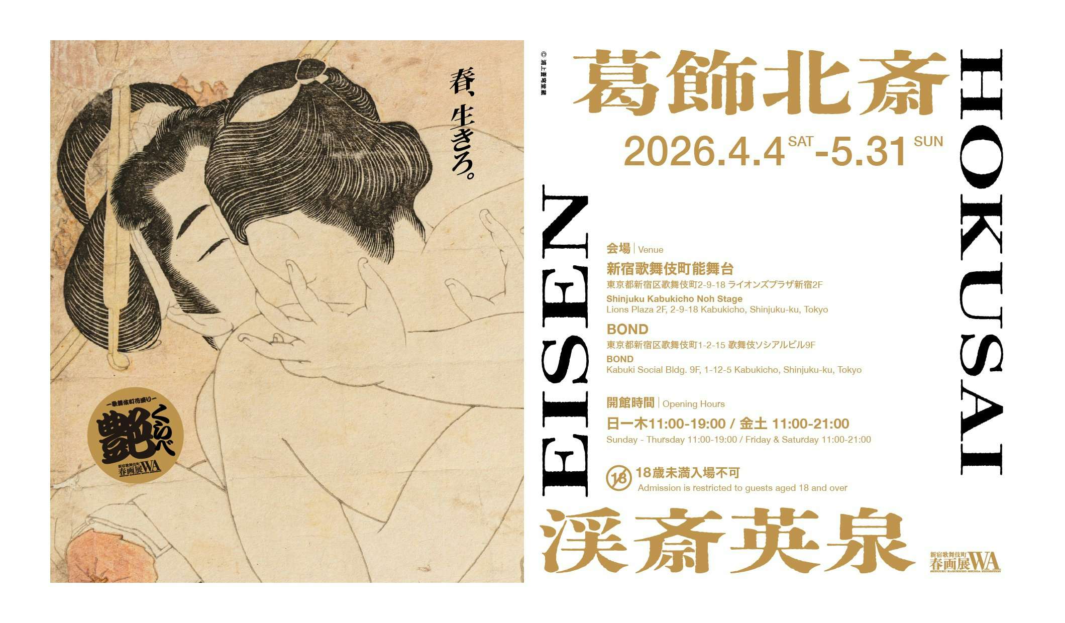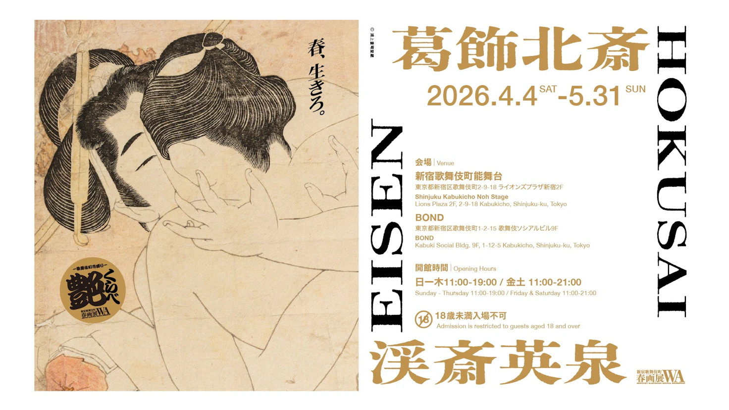 新宿歌舞伎町能舞台およびBONDで「葛飾北斎・渓斎英泉 艶くらべ ー歌舞伎町花盛りー 新宿歌舞伎町春画展WA」が開催される。