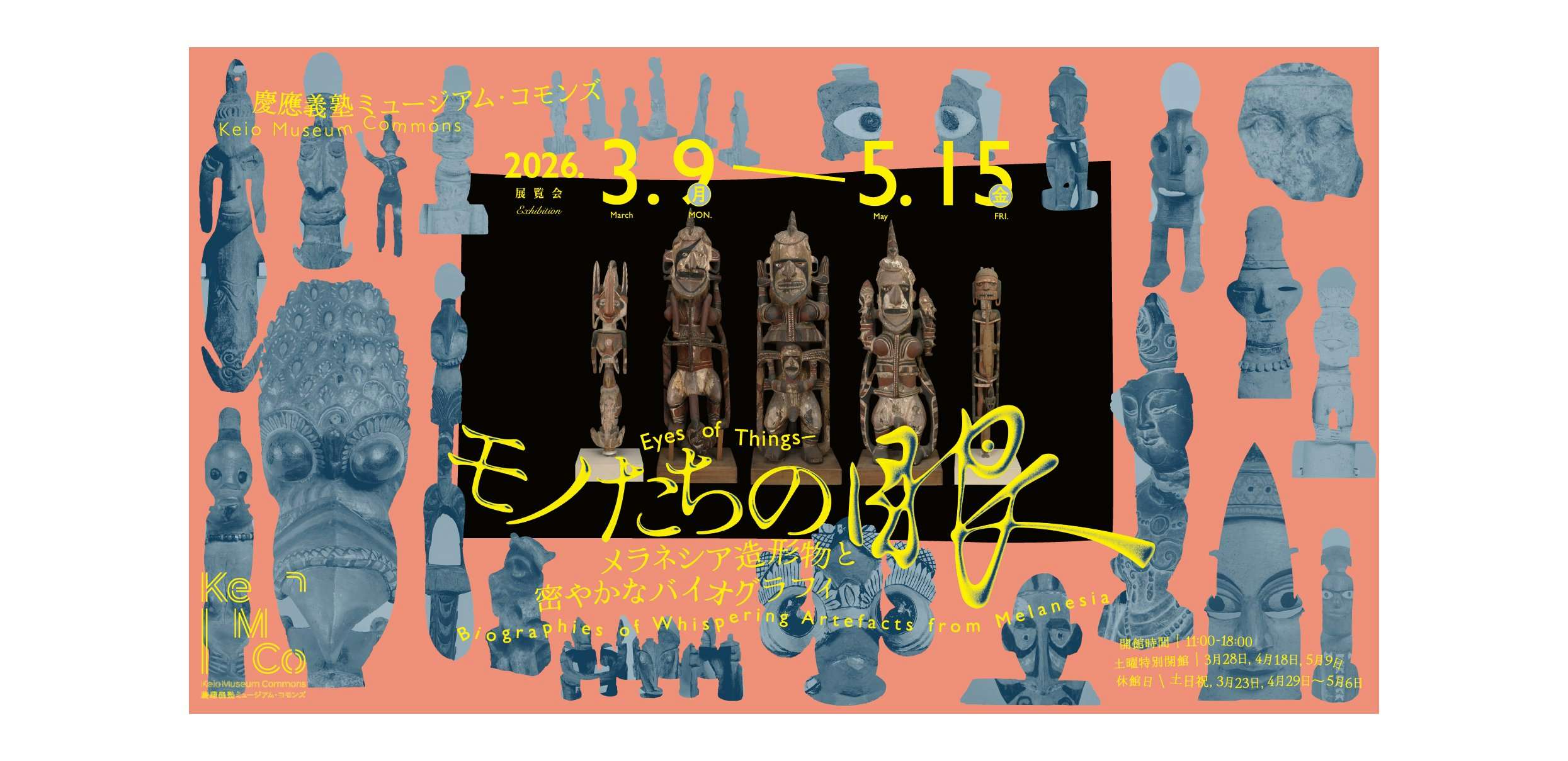今回の展示では、慶應義塾大学の民族学考古学研究室で管理されてきたウリやマランガンと呼ばれる木製祖霊像をはじめ、他地域の民族資料や考古資料、大学コレクションの美術作品などを紹介。これらのメラネシア造形物のバイオグラフィに触れつつ、「眼」をもつモノたちを通して、モノと人間の関係について考える。