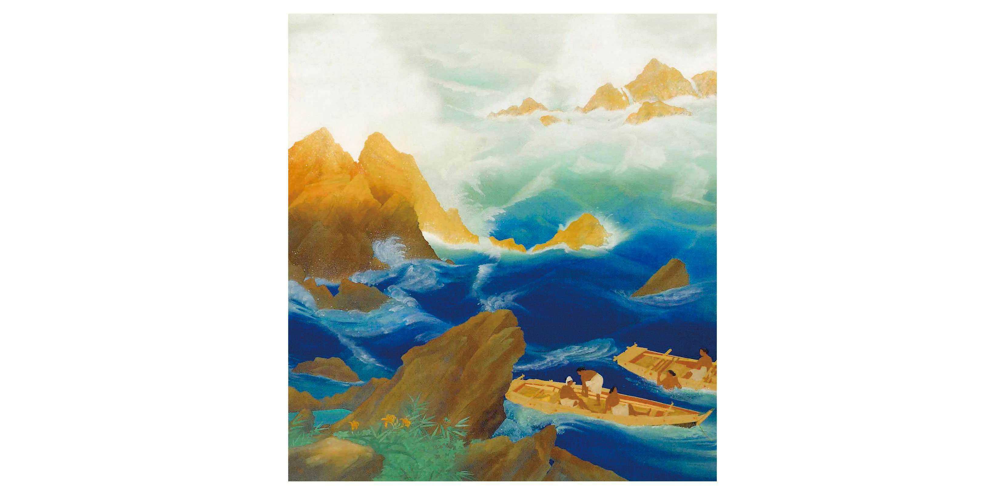 本展では山口蓬春の風景表現に注目し、新興大和絵会での活動において発表されたやまと絵の風景画を起点に、《三熊野の那智の御山》(1926)、《緑庭》(1927)、《潮音》(1928)に至るまでの展開を紹介。群青や緑青などの岩絵具を用いた風景画を通して、やまと絵の形式を刷新する画風を見ることができる。