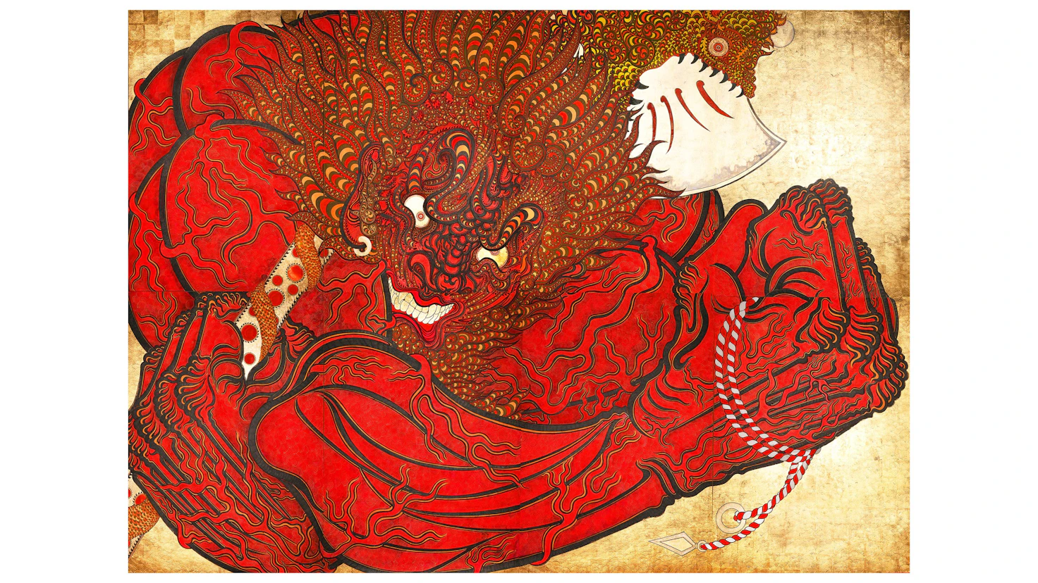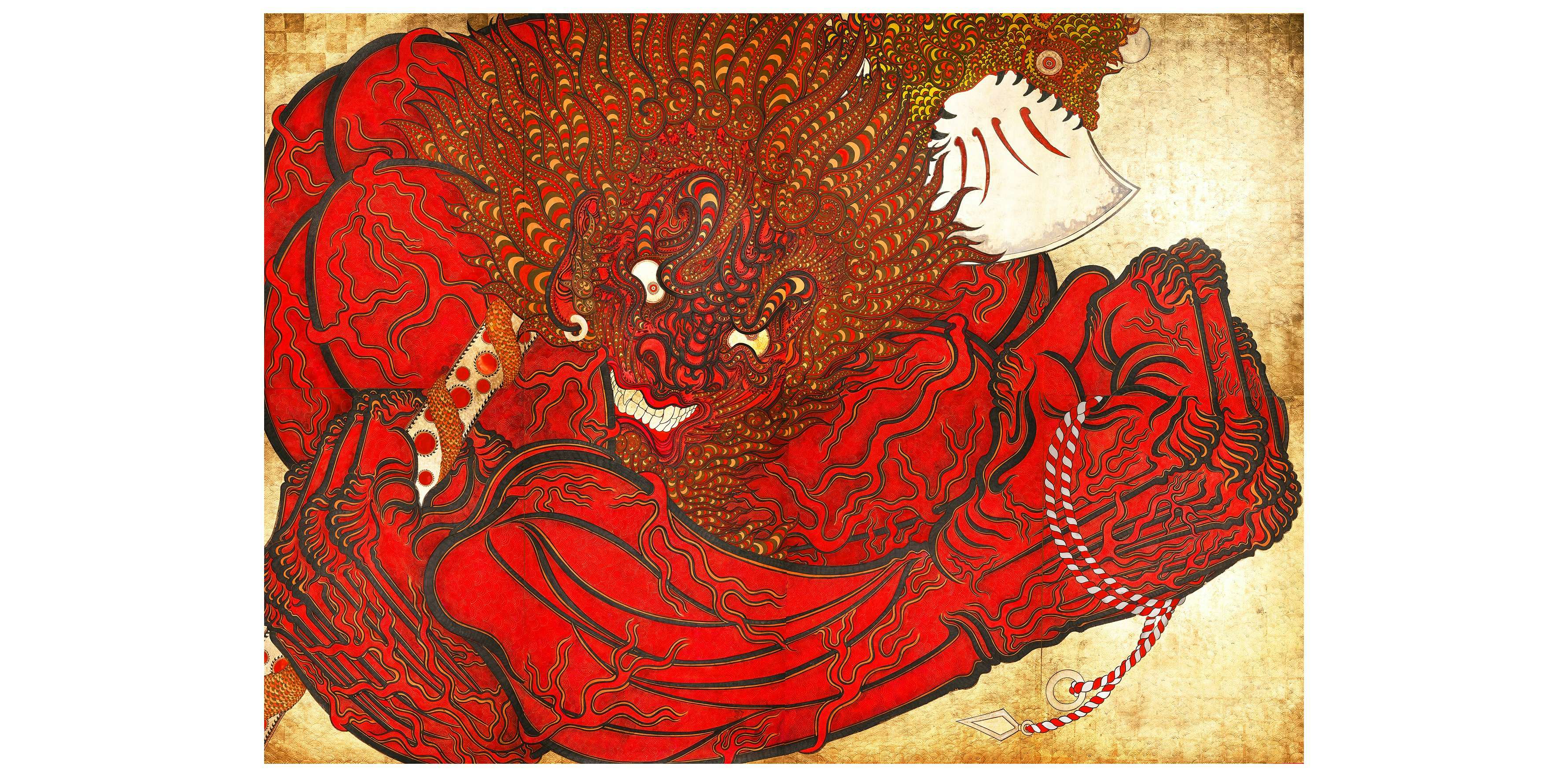 本展では、日本神話の荒ぶる神、須佐之男を主題に、46×64メートルの巨大な絵画作品3点を中心に、絵付けを施した石や面、達磨を含む十数点の中小品を展示。帯刀した武の神として描かれた《建速須佐之男》、牛頭天王を起源とする《祇園大明神》、インド神話の蛇神ラーフを原型とし日本で須佐之男と結びつき習合した《日月蛇頭黄幡神》の3点の大作が発表される。本展では神仏習合により牛頭天王とも同一視される須佐之男の名を拠り所とし、派生と習合により織りなされた畏怖と信仰に向き合う。
