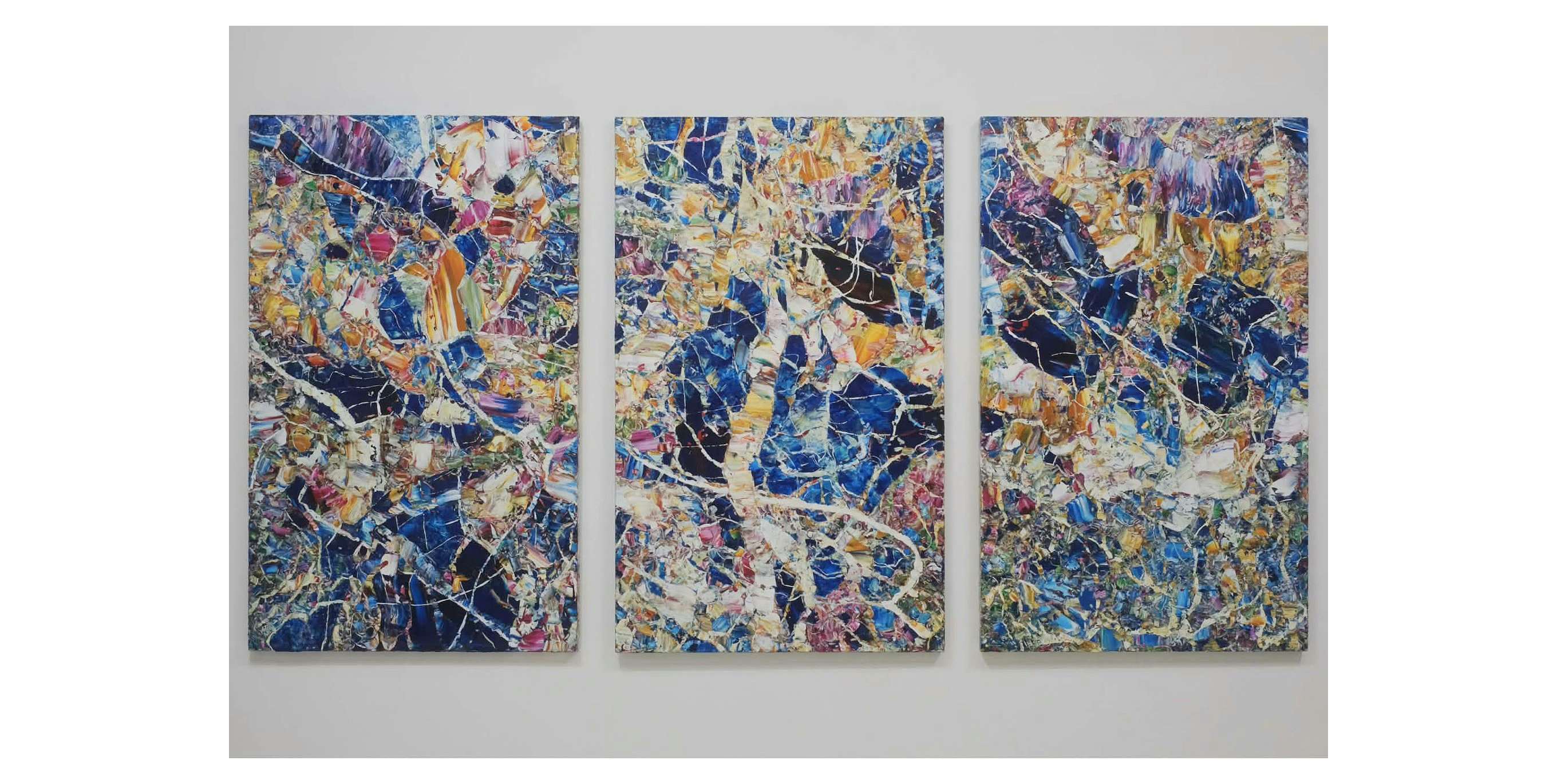 本展では、石黒が継続して取り組んできた「マーブレスク」シリーズの最新作を発表。展示は、ショーケースに収められた三連作に加え、実験的な小品絵画群によって構成されている。「マーブレスク」は、大理石の断面を起点としながら、地質学的時間を抽象化する絵画シリーズ。透視図法や主体の視点を排除した画面は、人間中心主義的な風景観が解体された後に残る「地質の風景」を提示する。今回の展示は、地質的時間という視点から、抽象絵画の新たな位置づけを示す試みとなっている。