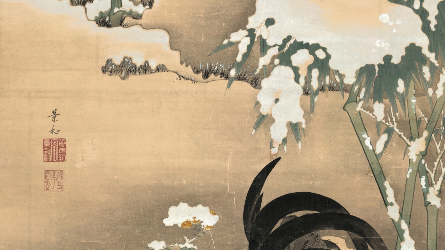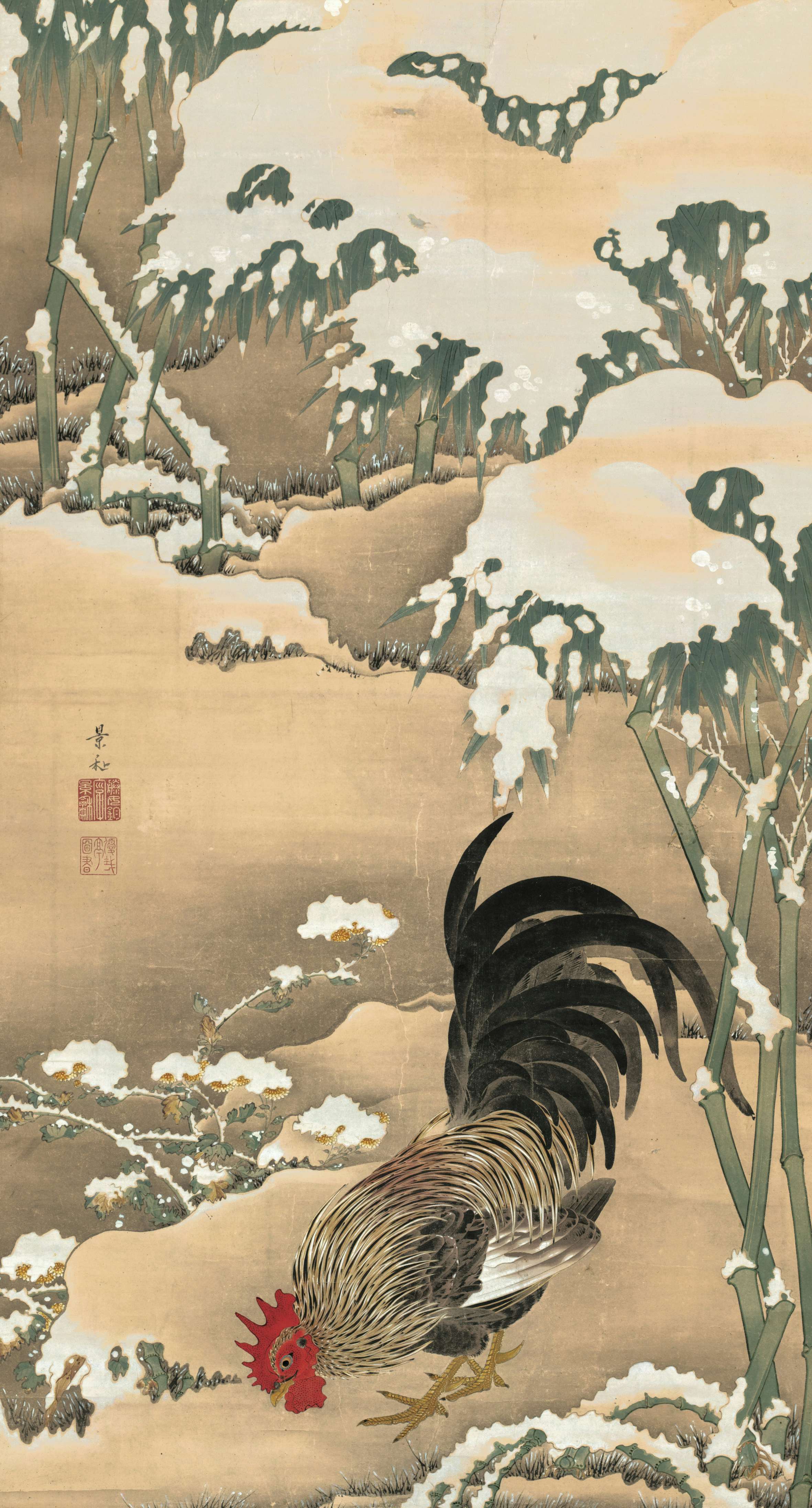 細見美術館のコレクションより、伊藤若冲の《雪中雄鶏図》が福山市で初公開される。