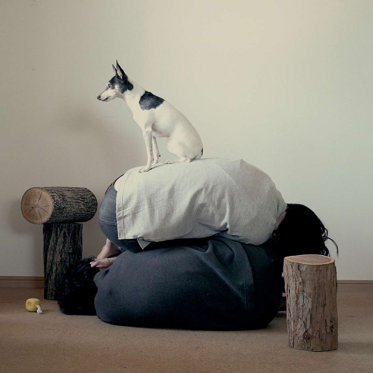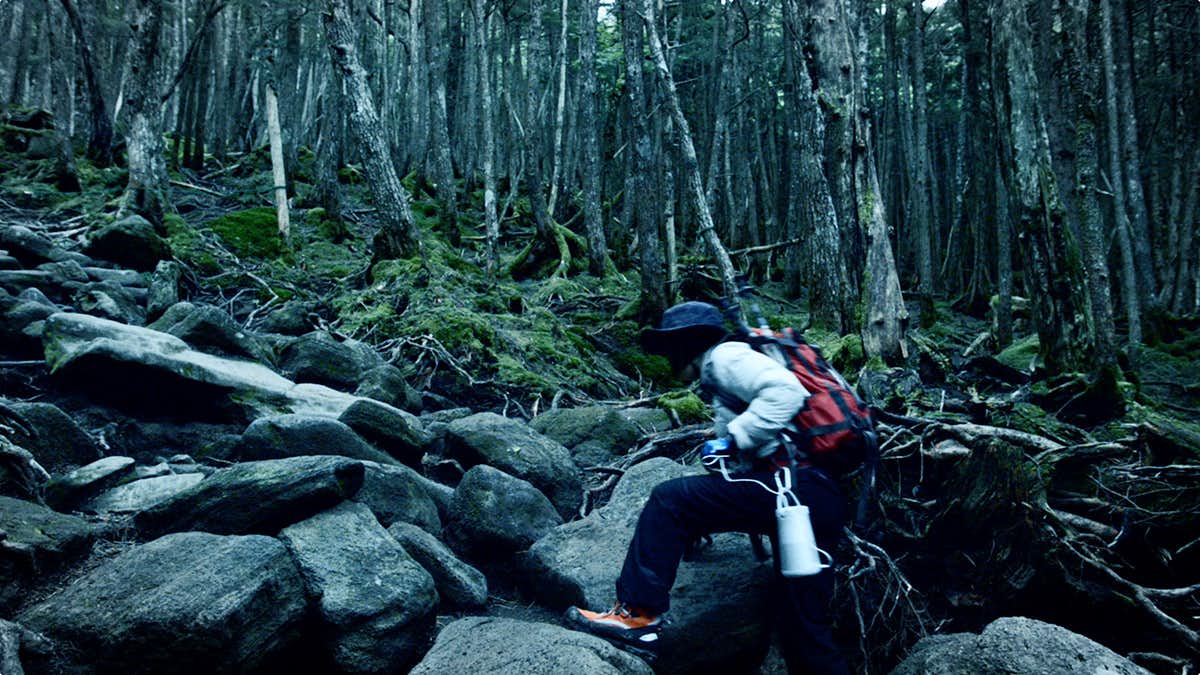 海と山という対極のものを向き合わせた《海の声を山に聞かせる》は、とある山を登りながら、作家2人が海で録音した波の音をスピーカーで流し、木々や鳥、連なる山々に聞かせている。いっぽう、「もの派風な構図を意識した」という《積み石》では、2人がうずくまって重なり合い、動かない石を演じることで「もの」と「生きもの」との境界あるいは連続性に疑問を投げかける。