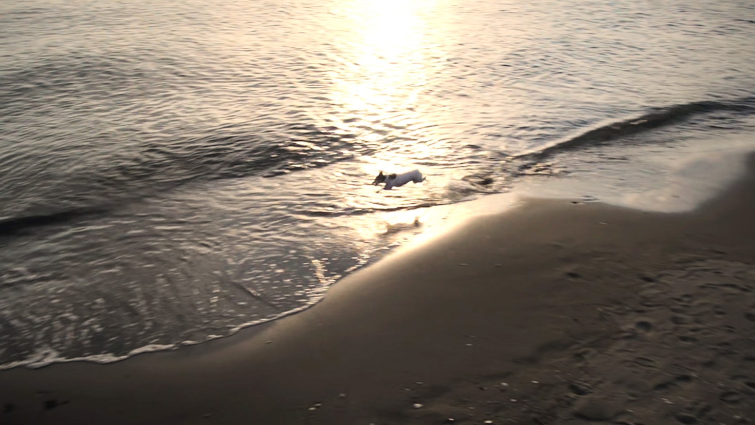 《犬か海か》は、《Anne and Anne's Sculpture》や《積み石》でも登場する作家の愛犬、アンが海に向かって延々と吠え続ける様子を映した作品。波を生き物と思っているかのように戦いを挑むアンと、応戦するように激しく波打つ海との不思議な対立構造を映し出す。《北極星》は、星空をビデオで撮影し、北極星が映る数ピクセルのみを拡大。道標として人々を導いてきた星の光で部屋を満たす。