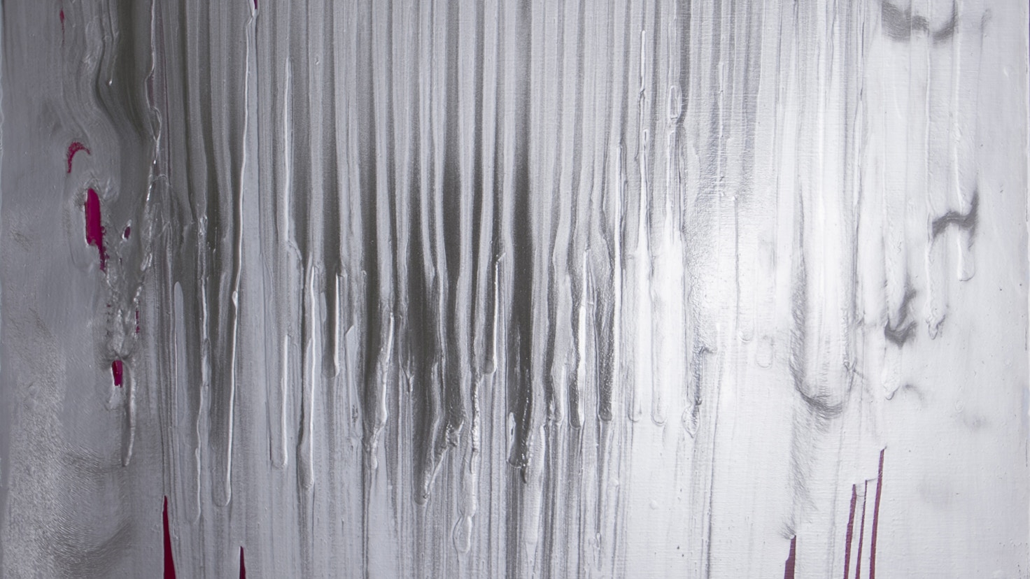 その後、15年の長い沈黙の時期を経て、87年から突如として銀一色の絵画作品の制作を開始。筆を使わず、絵具を流し込んで画面を覆っていく手法を用いた「アルミナ頌」「光ノ表面トシテノ銀色」などのシリーズで、「描く」という行為を問い直した。