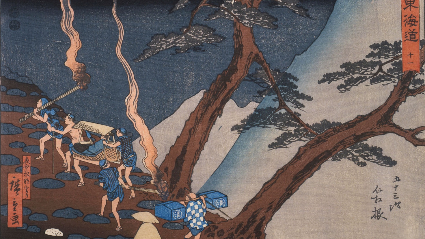 天保3年(1832)の夏、広重は京都御所へ御料馬を献上する八朔御馬進献の行事を記録するために江戸から京都へ上ったとされ、道中のスケッチをもとに《東海道五拾三次之内》を描いた。本作は保永堂と僊鶴(せんかく)堂から共同で出版、のちに保永堂の単独出版となり、53ヵ所の宿場町に日本橋と京都を加えた全55図の大判錦絵として完結。これが、今日もっともよく知られる「保永堂版」の東海道となる。