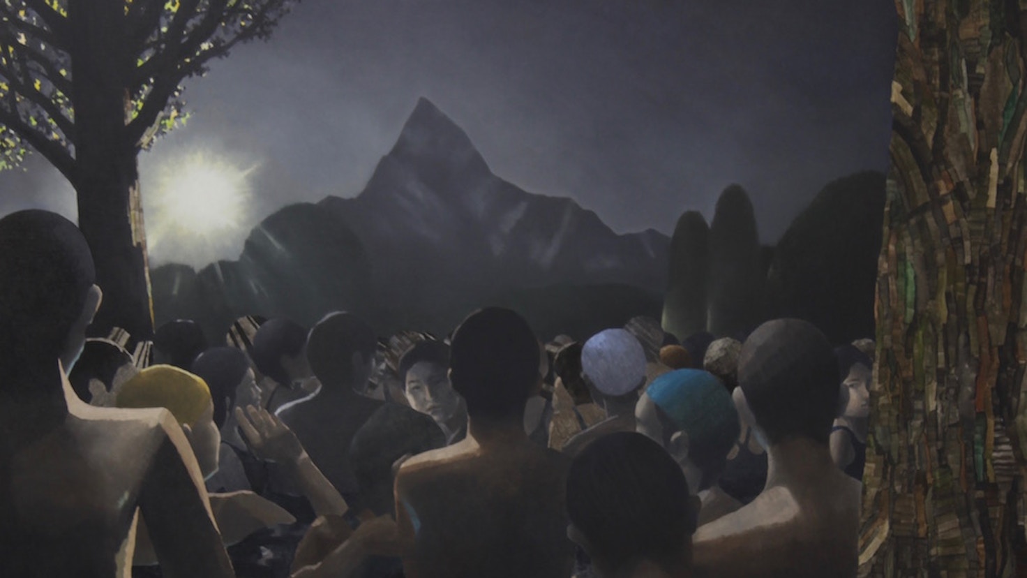 たとえば、かつてプール監視員を務めていた頃に見続けた、水中を移動する群衆とそれに伴って発生する渦巻きの様子に、記憶に残った山や森などの別の光景、あるいは政治デモやインターネットといった社会的要素を加え、絵画上にしか存在しえない「プール」の光景を示した。