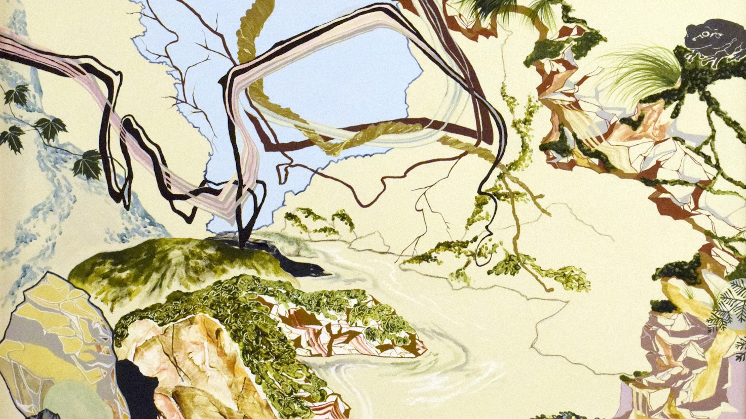 1枚の絵で様々な視点を追体験させられる田中の作品は、作家が経験したことが抽象的な図像によって再構成され、日常の風景をベースに描かれることで、動的でありながら煩わしさがない、不思議な爽やかさを伴って表現される。
