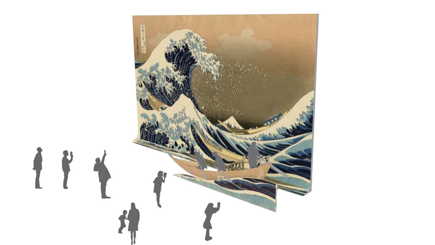 本展のキーワードは「なりきり」。高さ約7メートル以上の特大スクリーンに映像化した《冨嶽三十六景・神奈川沖浪裏》を投影し、声を出すほど波が大きくなるインタラクティブな仕掛けを施した「体感! ザパーン ドプーン 北斎」など、作品の中に入ったかのような体験ができる5つのコーナーを用意するほか、本館などでは『びじゅチューン!』で歌になった作品の本物を一部、鑑賞することができる。