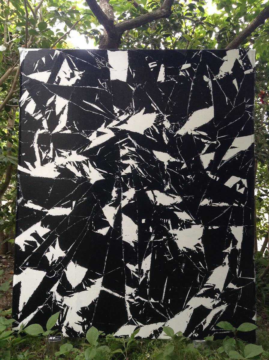 最近のアプローチとしては、切り絵の技術を応用して、線対称の図形を画面上に作り出す作品を制作。これは、同じ大きさで色違いの膜を二枚重ね、作りたい図形の半分の形で切り込みを入れる。それから、二枚のうち片一方を180度反転。向かい合う形となった、切り込み同士をお互いに噛み合わせるように重ねていくと、二枚が完全に重なった瞬間、画面の中心に線対称の図形が現れる。それは、作品から離れて見たときには全く気付かれることなく、おそらくは極めて単純で面白みのない記号のような色面構成としか目に映らないことだろう。