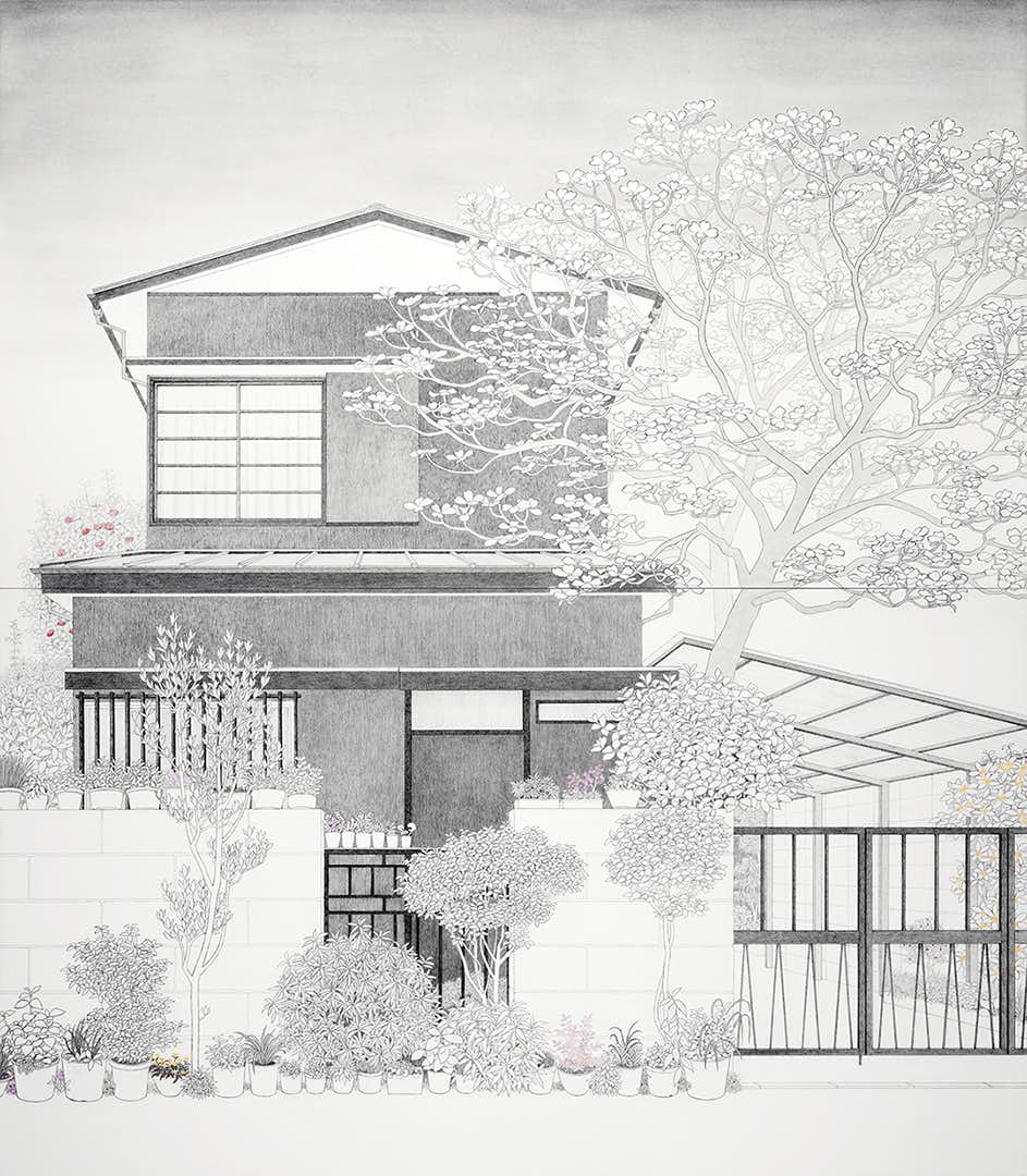 東京や横浜といった都市部にありながらも自然の気配がある住宅地の風景、花壇などを細密な鉛筆画や水彩で表現し、見慣れた日常風景であると同時に超然とした趣を持つ作品を手がけてきた須藤由希子。その作品は、街を散歩することから始まり、念入りなリサーチをもとに生み出される。