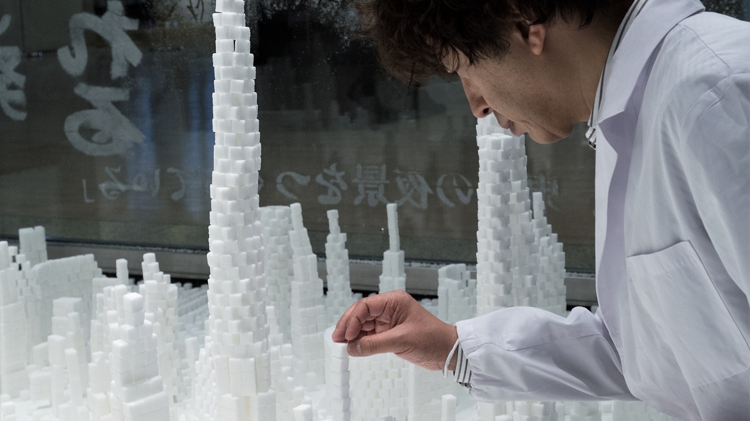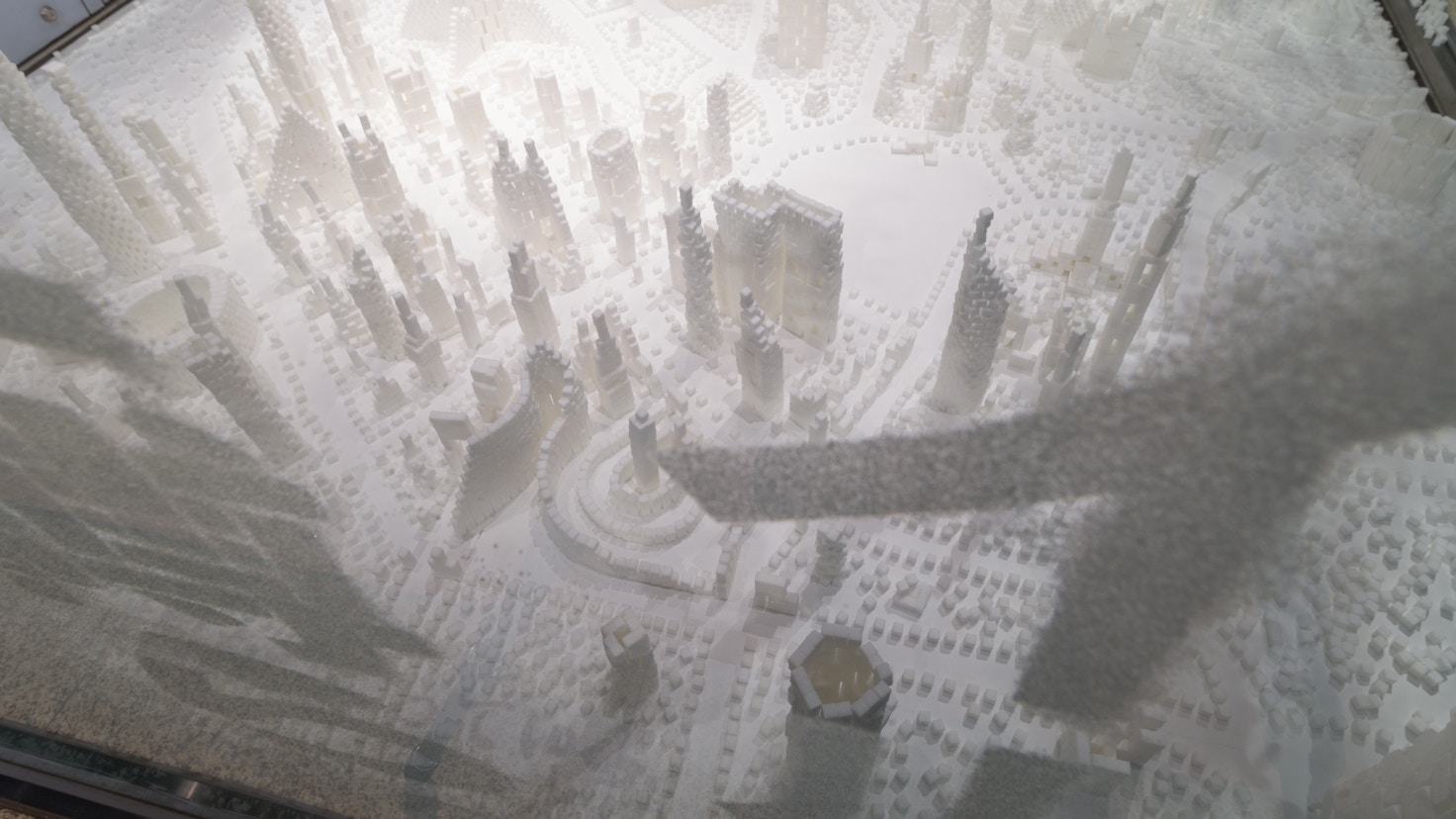 本展では、砂糖製の大阪市街をギャラリー空間に展開。一見まばゆく見える街は不安定で脆く、不穏な世界情勢の下で暮らす今日の日常を思わせる。