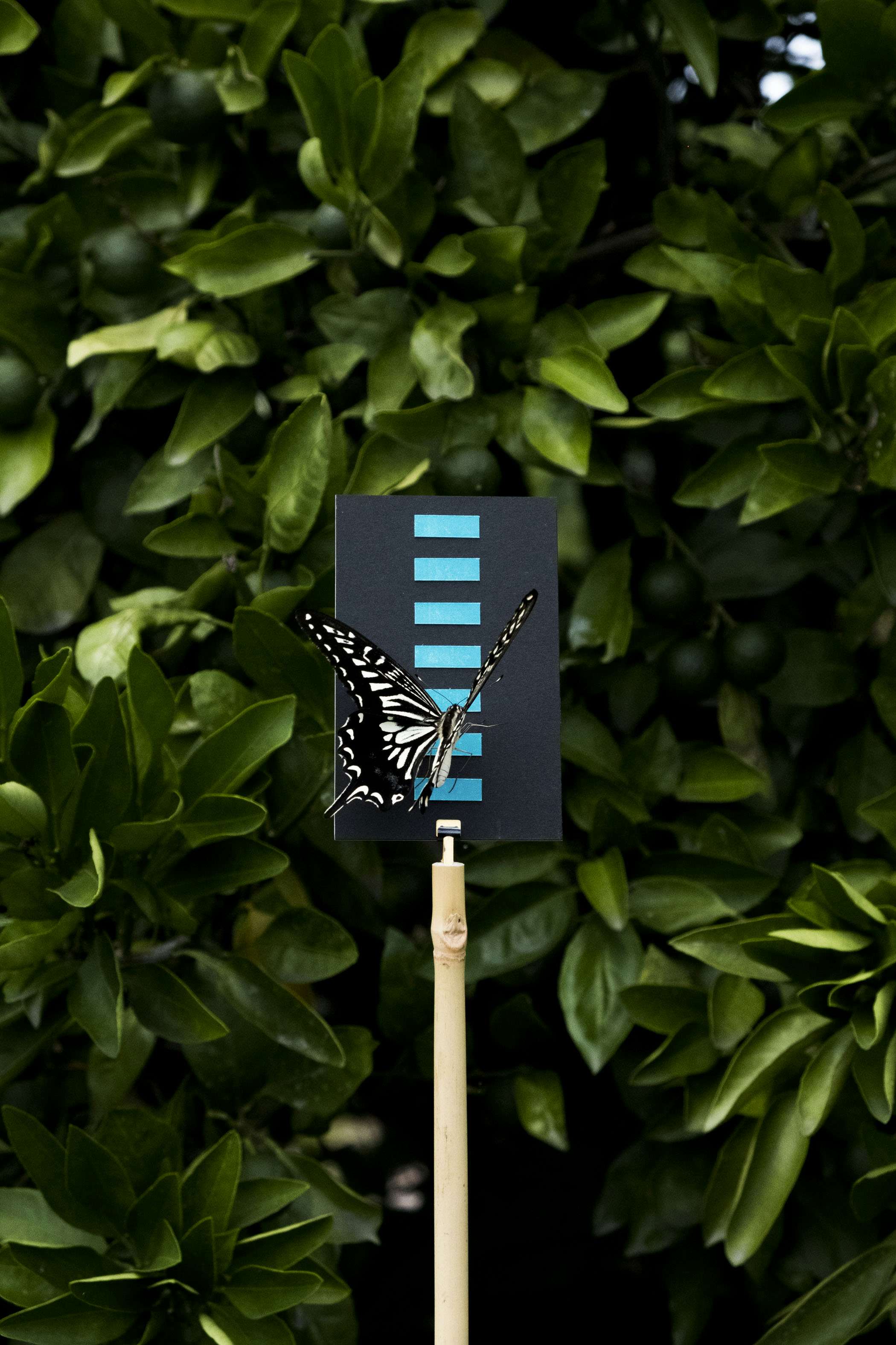 本展で発表する作品は、木曽川流域の「石」とそこに生息する「チョウ」の観察から制作を開始。一連の作品には、地理学者の志賀重昴(しげたか)の手紙での一節がきっかけで木曽川沿岸が「日本ライン」と呼称されるようになったこと、昆虫学者の名和靖(なわ・やすし)が下呂市金山町で新種のチョウを「岐阜蝶」と命名したこと。この2つのストーリーラインが設定されている。
