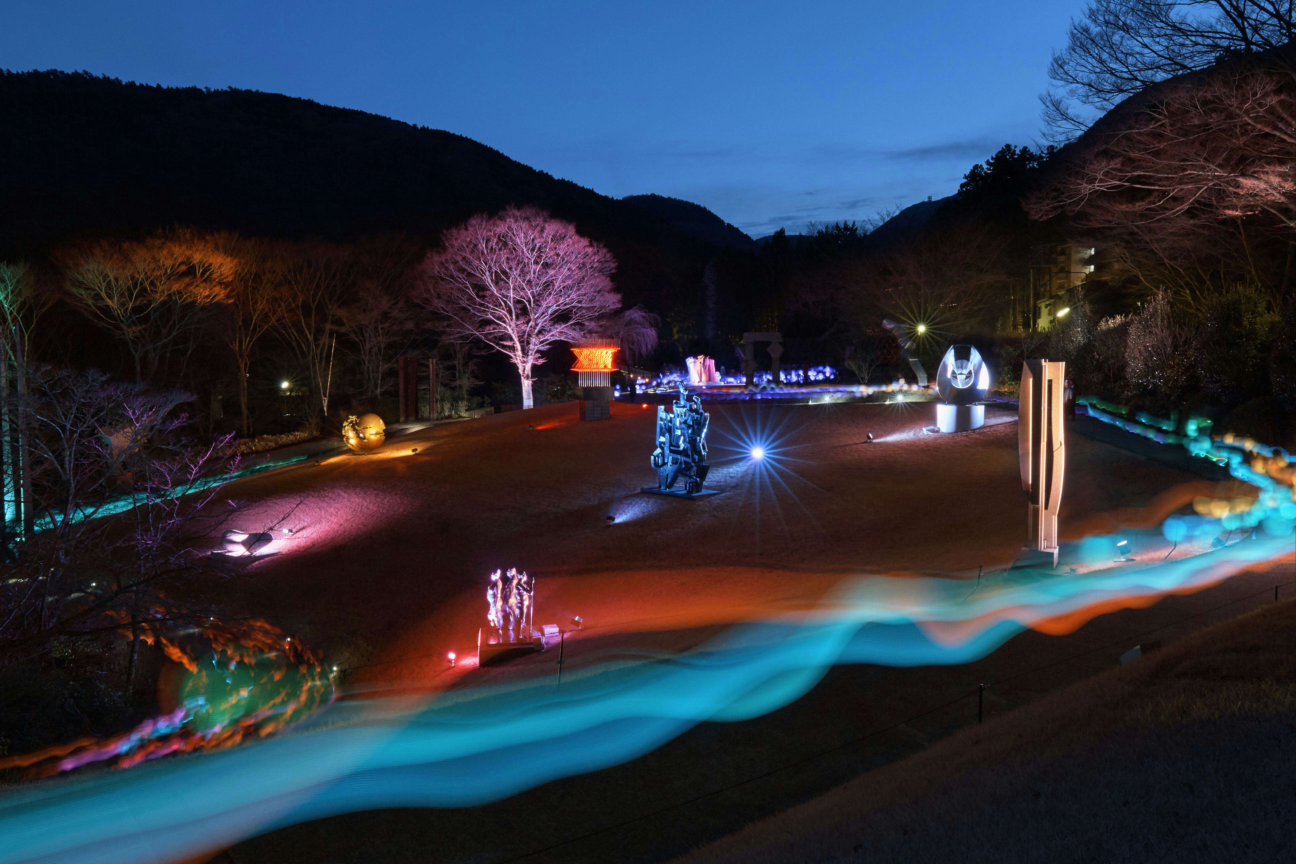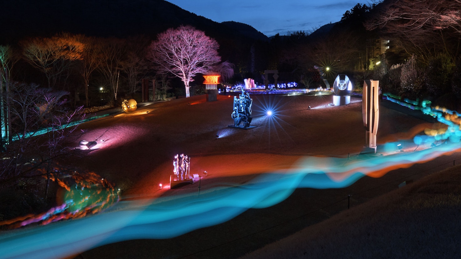 彫刻の森美術館で毎年催される、光のアーティスト・高橋匡太による参加型ライトアップ「箱根ナイトミュージアム」。無線で色をコントロールするLED提灯を持って夜の彫刻庭園を巡ると、出会う彫刻や風景のライトアップに呼応して色が変わり、参加者一人ひとりの動きによって美しい夜景が生まれる。