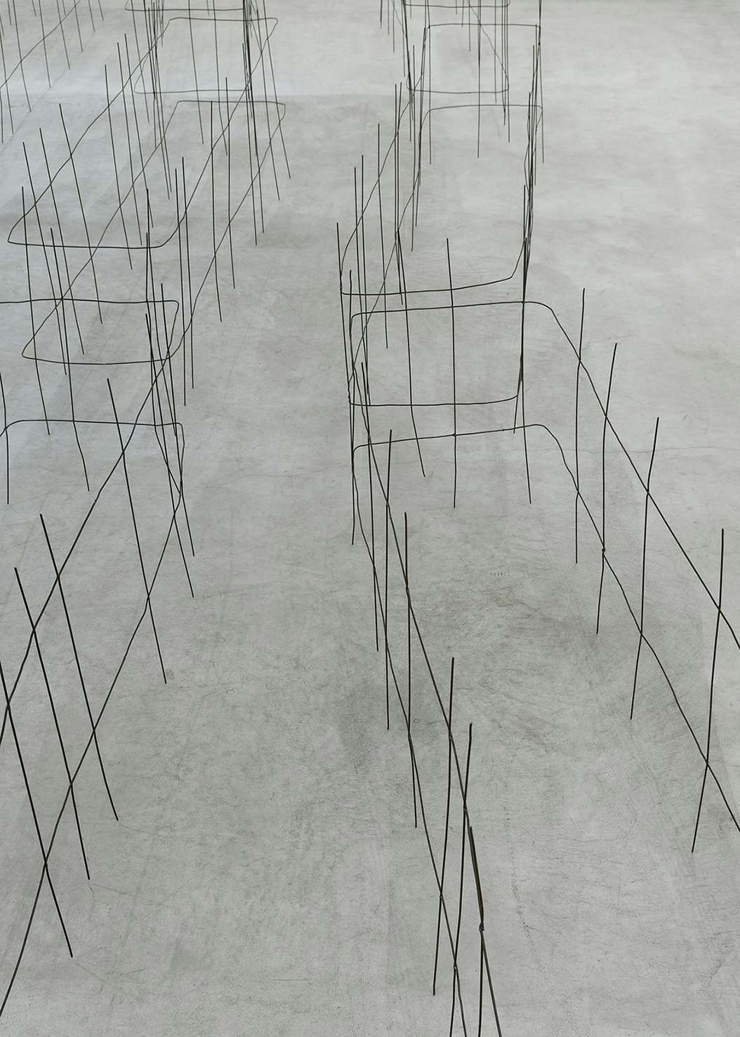 本展では、《四角》と題した新作インスタレーションを発表。「柵」のイメージから着想を得たという本作は、直径3ミリの鉄材のみという最小限の素材で構成される。