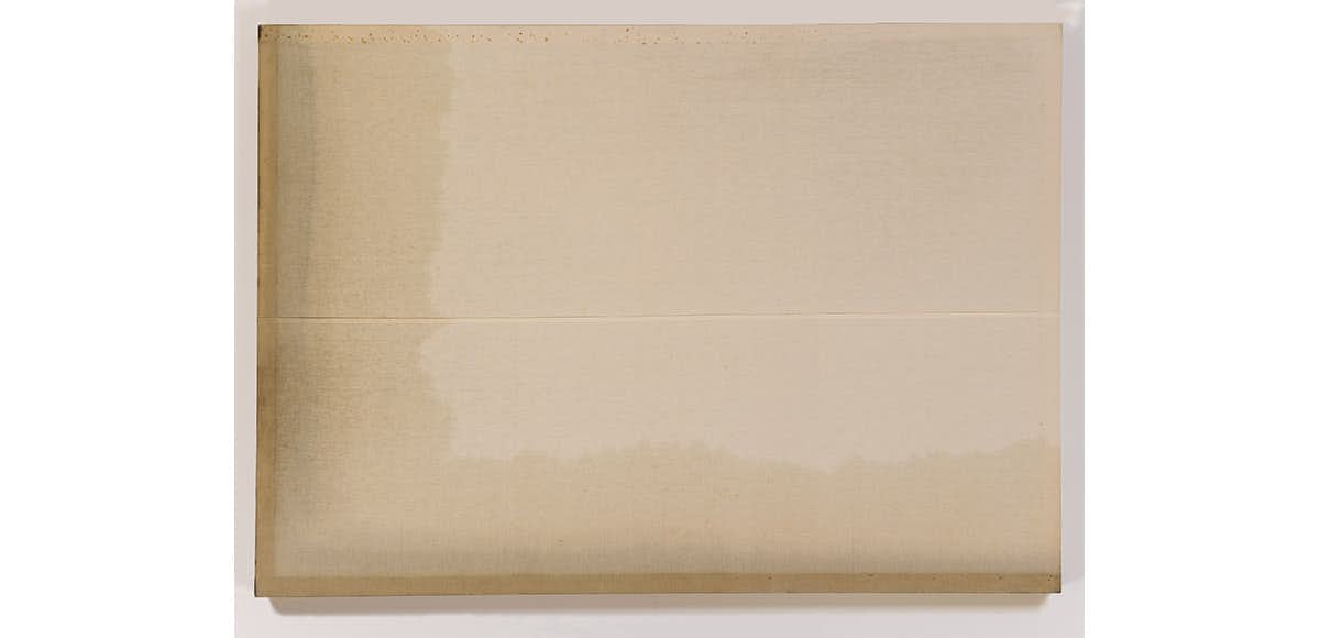 物と物との関係や物と身体との関係から生じる物質性に着目した榎倉。壁に廃油を染み込ませる、廃油・アクリル塗料をつけた木材を綿布に押し当てた滲みを利用するといた独特の技法によって、「絵画」の枠組みからの逸脱を試みた。榎倉の代表的なシリーズのひとつ「干渉」では、滲みによって時間の経過を視覚化し、そのいっぽうで、画面に取りつけられた材木が作品から絵画性を奪い、事物性を強く提示している。