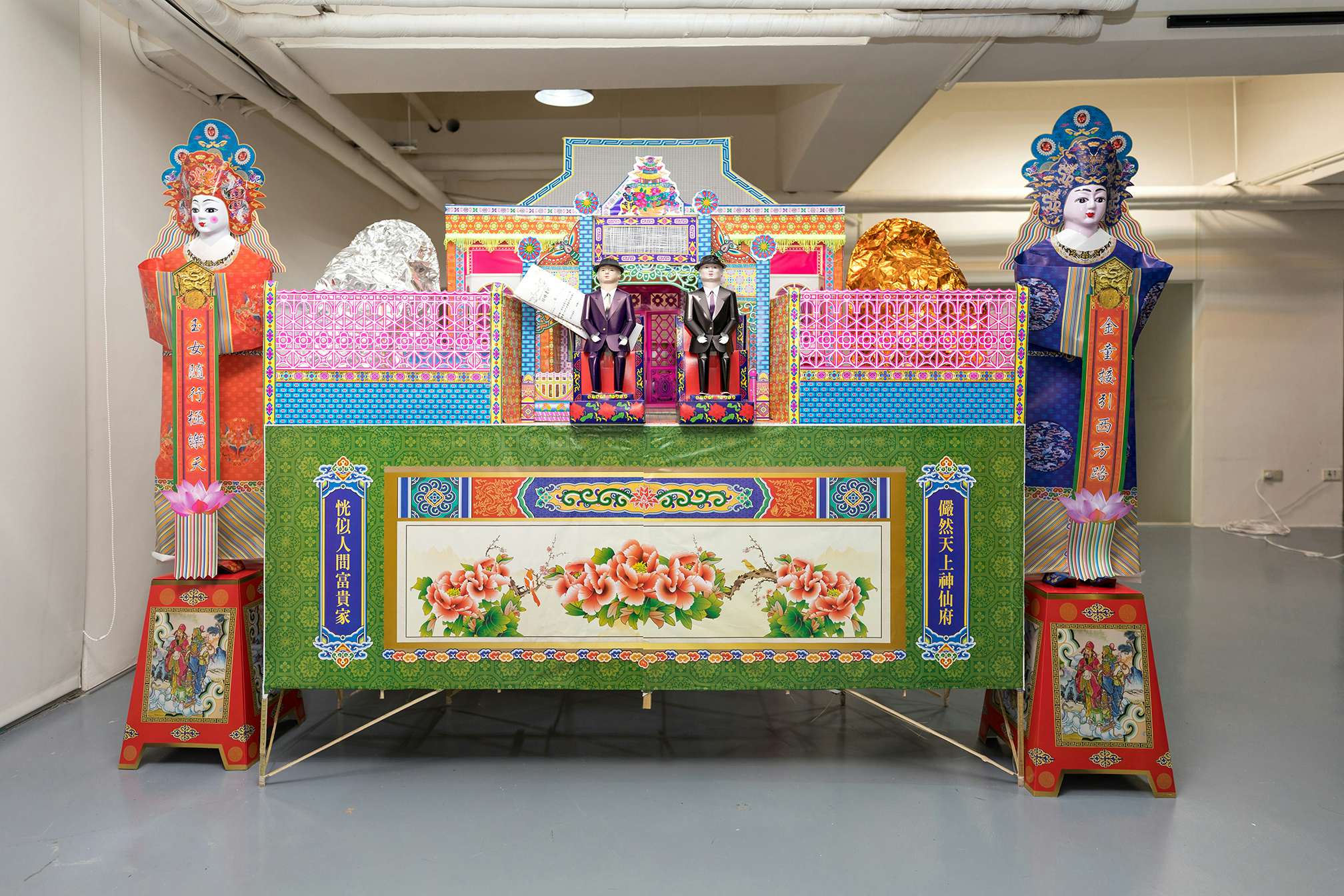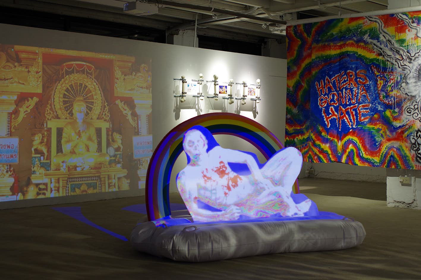 磯村の直近2年間の活動を紹介する本展は、LGBTQや移民などをテーマとする重要なアートワークのひとつで、タイの仏教美術を再解釈したインスタレーションや、新作のドローイング作品、在日ネパール人との協働作《HOME PARTY, 2017》の再インストールや、当事として台湾での同性婚をテーマに制作した《Joss Paper for the lovers, 2018》、そこから展開された《LOVE NOW, 2018》を展示。かつての社会的な違和感を取り上げる作風から、LGBTQや移民、宗教といったキーワードを組み込んで制作を行う近年の活動までを総括する。