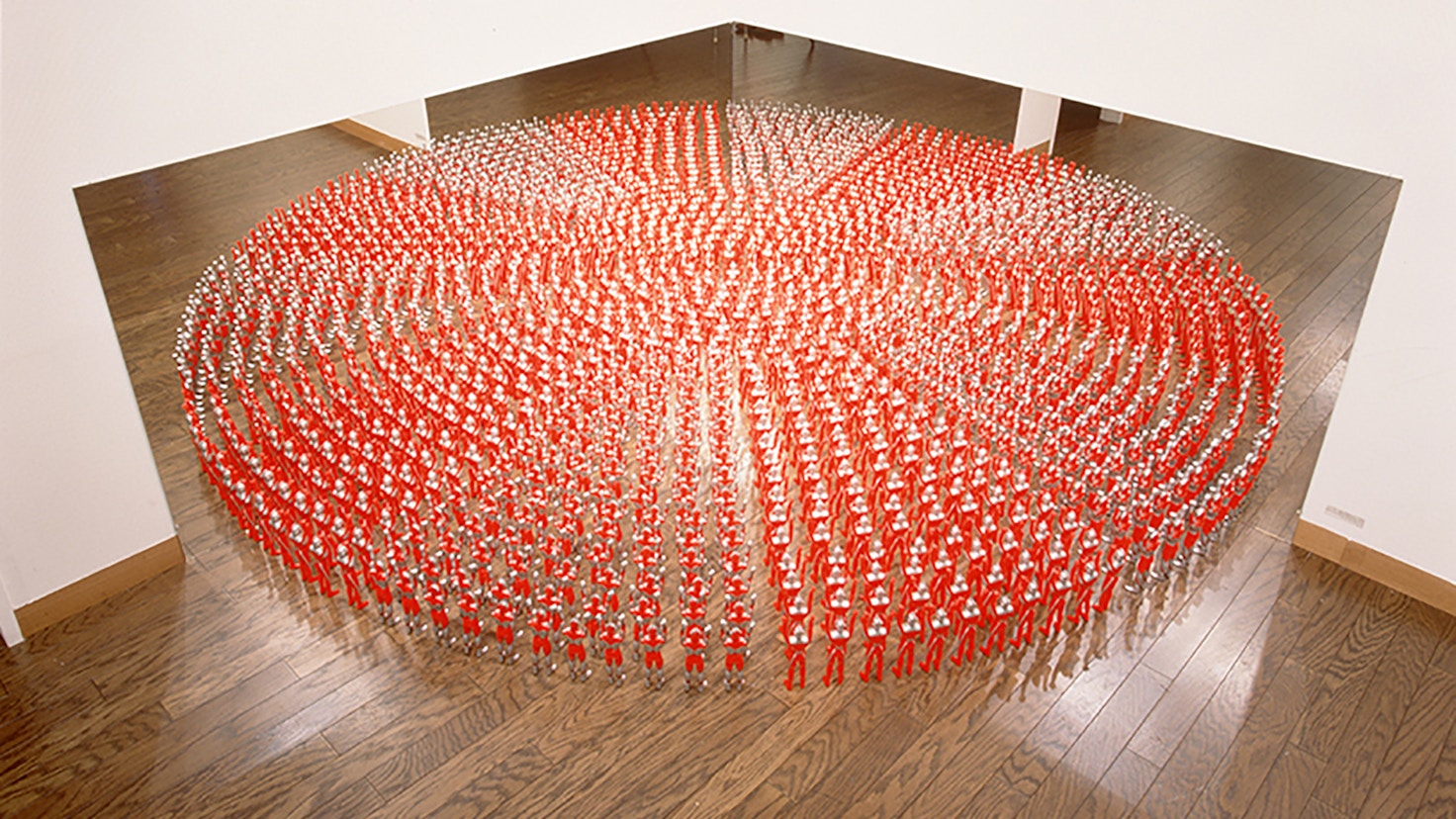 人々の暮らしがめまぐるしく移り変わった昭和と平成で、日本の美術家たちは、社会的な関心を反映させ多様な表現を展開してきた。同展は、「ヒーロー」と「ピーポー」をキーワードに、そうした傾向にある作品の中で示された、特別な存在と無名の人々という対照的な人間のあり方に注目。作家たちがつくり出した「ヒーロー」と「ピーポー」の姿を5つのテーマで紹介し、美術の領域に収まらず、紙芝居、マンガやアニメ、特撮といった大衆的メディアも取り上げる。