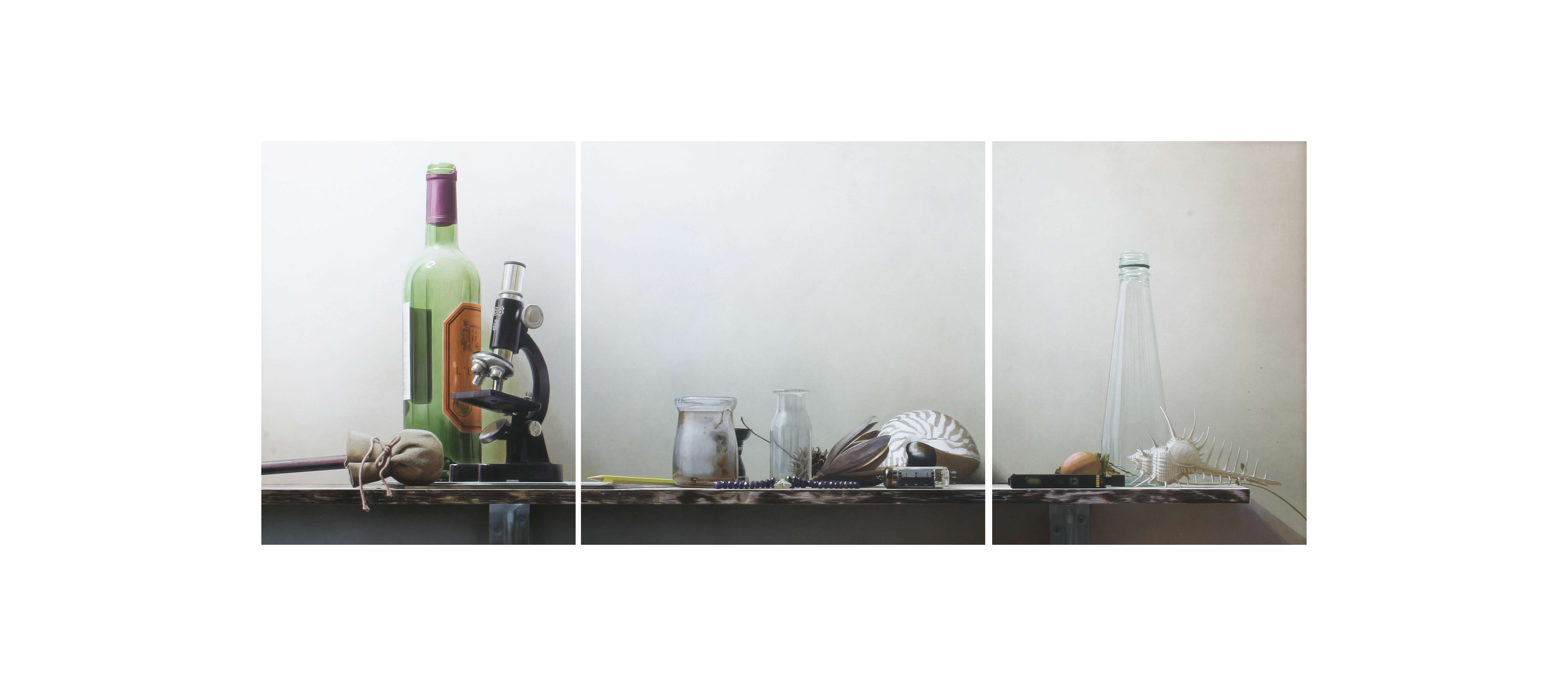 画家および彫刻家を志す新人の登龍門のひとつ「昭和会展」で東京海上日動賞(2011)を受賞した、沖縄県出身の画家・有吉宏朗。わずかな光が差す白い壁を背景に、ガラスや花、貝殻など様々なモチーフを散りばめ、写実的な絵画を描いてきた。