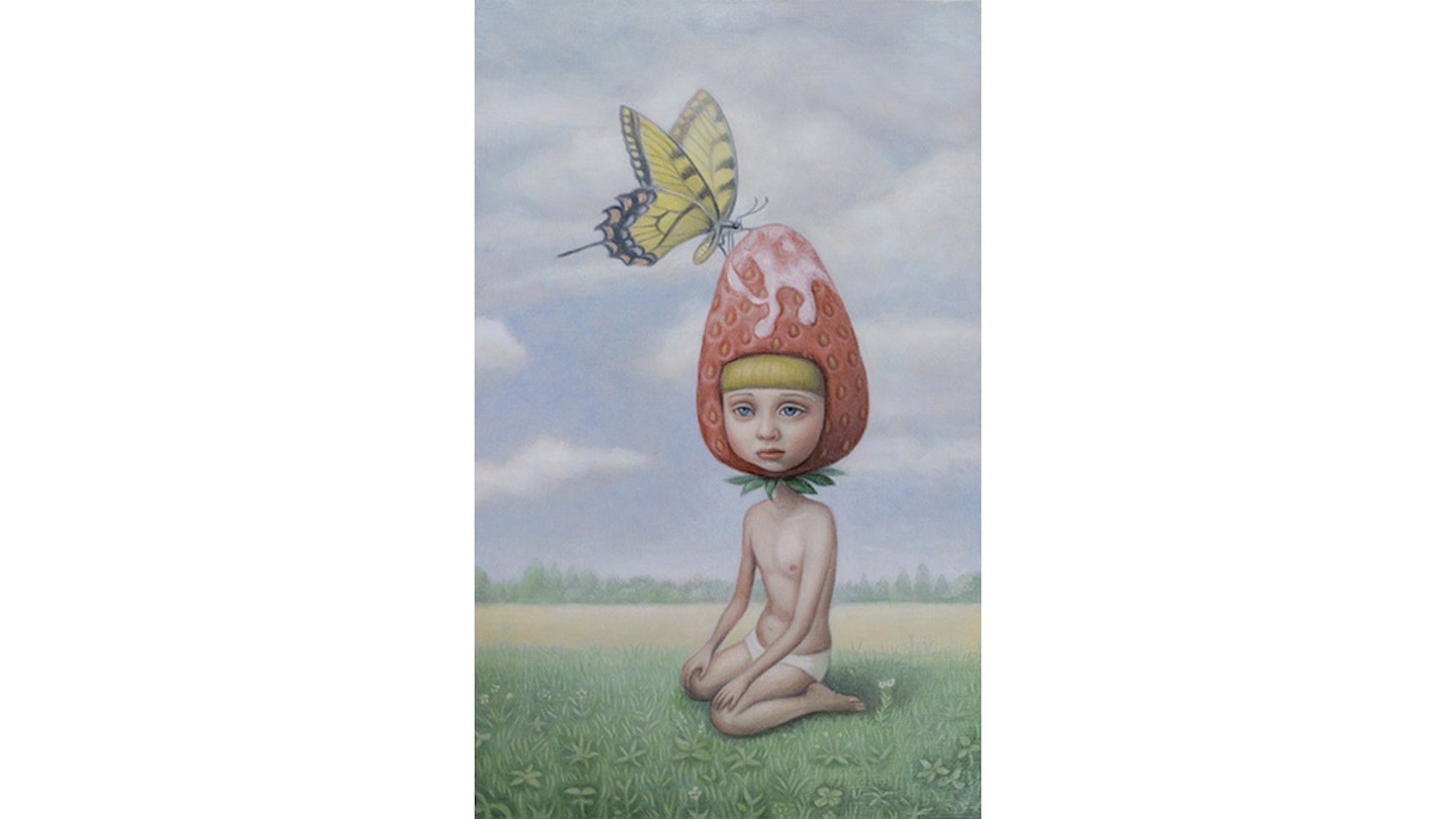 冷たく寂寛とした白昼夢のような世界に、デフォルメされた人物や玩具や人形などのモチーフが、刹那と狂気の間の消えゆく美として表出。「マコーレー・カルキン」シリーズには、15世紀から伝わる宗教絵画で用いられているグレース技法が用いられている。薄い絵具の層を細く柔らかい筆で何層にも重ねて、透明感と色調の深み、きめ細かな質感を生み出す精巧な制作の過程は、ショービス界で消費され使い捨てされていく人々へ向けられた海老原の祈りを思わせる。