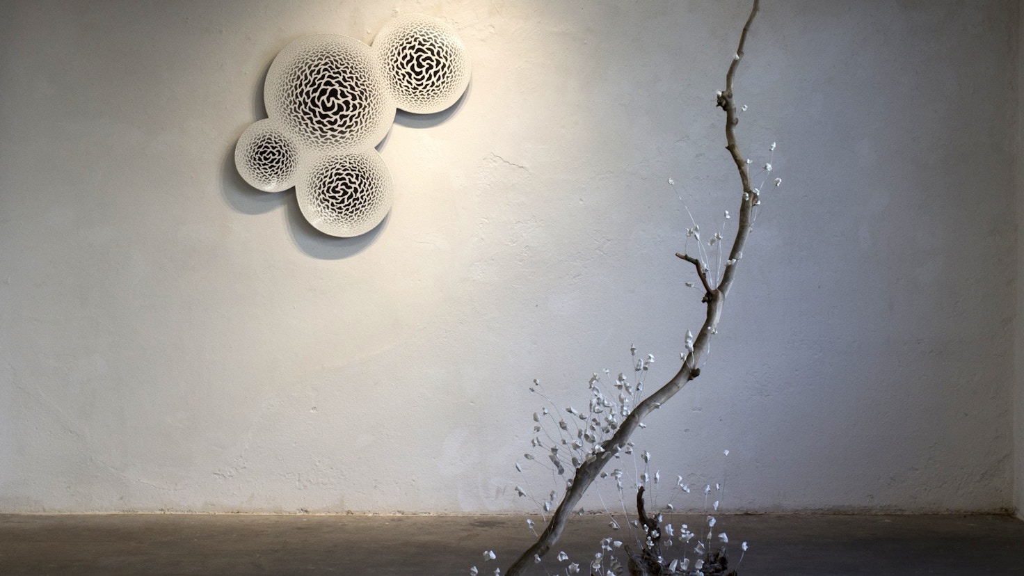 本展は、作家が幼少時に暮らしたこともある須崎での初個展。自然の中にある有機体をモチーフに、明と暗、上と下、生と死といった表裏一体をドローイング、絵画、インスタレーションなどで表現してきた作家の活動を紹介する。