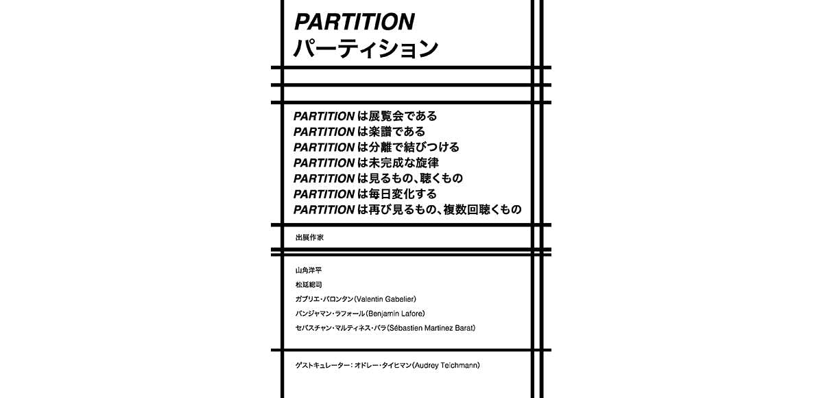 作曲家が楽譜を分節化すること、また本来は分離や分割を意味する「パーティション」。本展は、この「パーティション」というアイデアを、ガブリエ・バロンタンがキュレーション担当兼参加アーティストとなって、山角洋平、松延総司、バンジャマン・ラファールとセバスチャン・マルティネス・バラ、そしてゲストキュレーターのオドレー・タイヒマンの仕事のめぐりあわせの中で展開する。