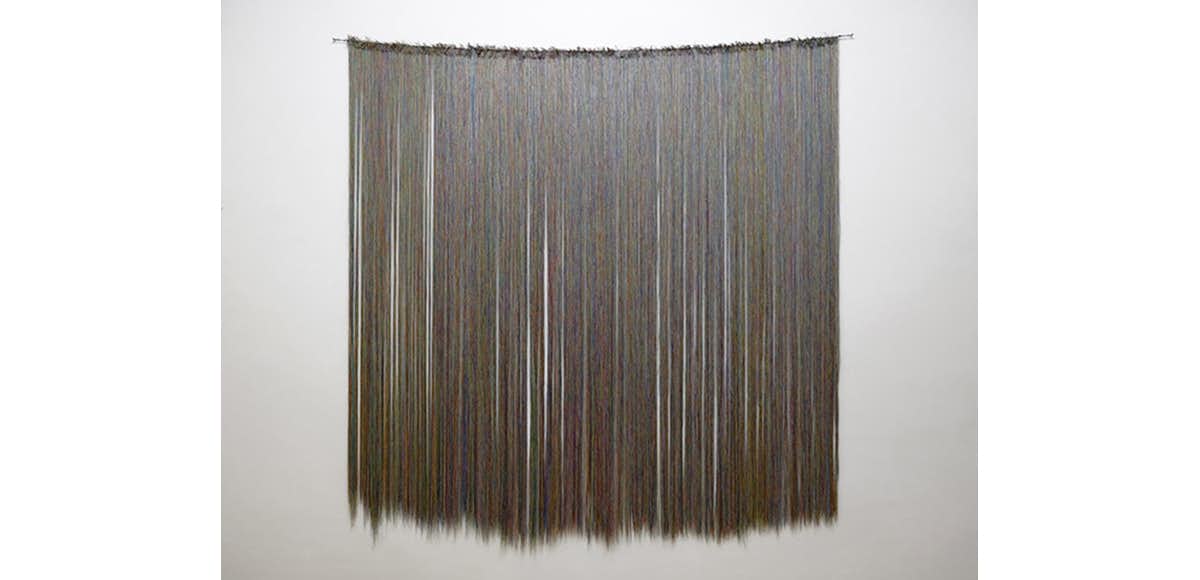 本展に並ぶ作品群のテーマは「stripe(s)」。様々な色の糸を作家自身の両腕を広げた長さに切り、たんに、支持体に何万本も括りつけて垂らした状態を作品として展示する。