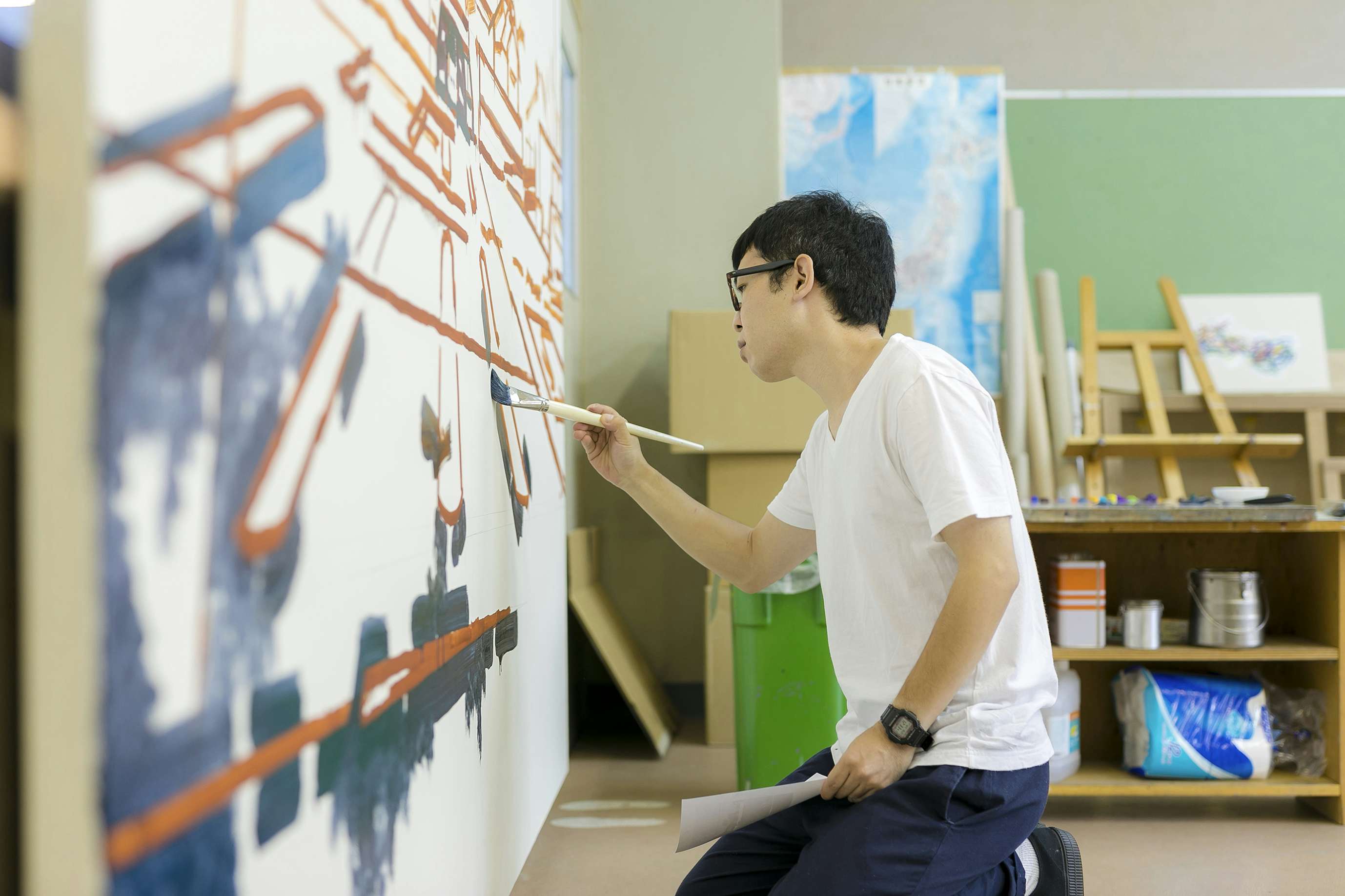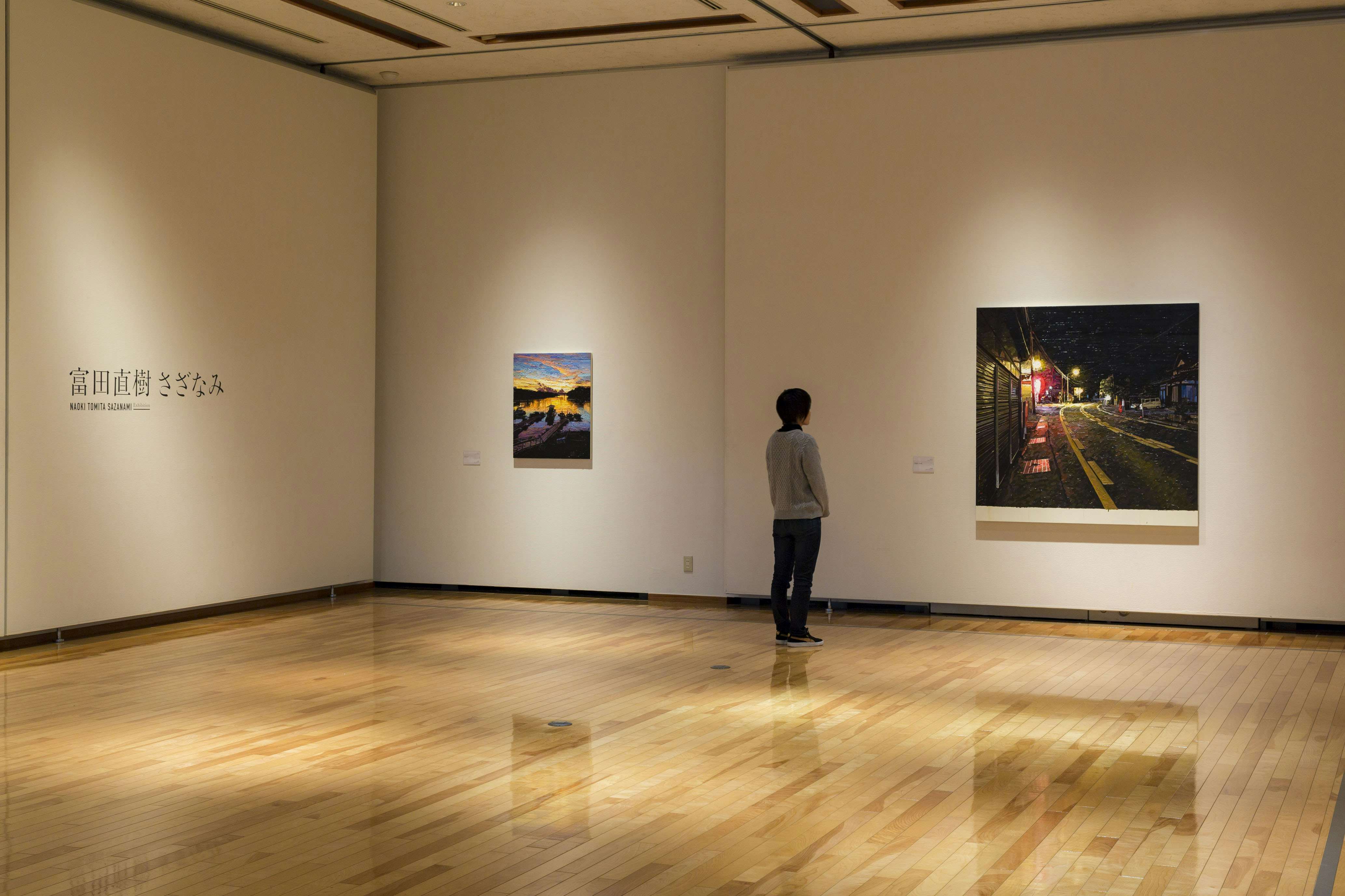 気鋭のアーティストによる地域交流型滞在制作と個展を組み合わせた「アーティスト・イン・レジデンスつなぎ」。2018年度は、大都市近郊の風景や若者をモチーフに、日常の空虚感とダイナミズムを湛えた作品を生み出してきた富田直樹が招聘作家として迎えられ、8月から約3ヶ月間津奈木町での滞在制作を行った。