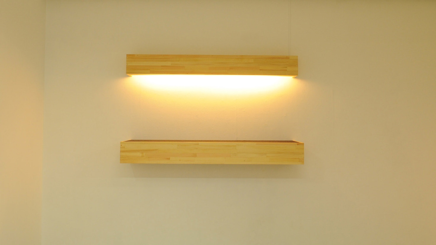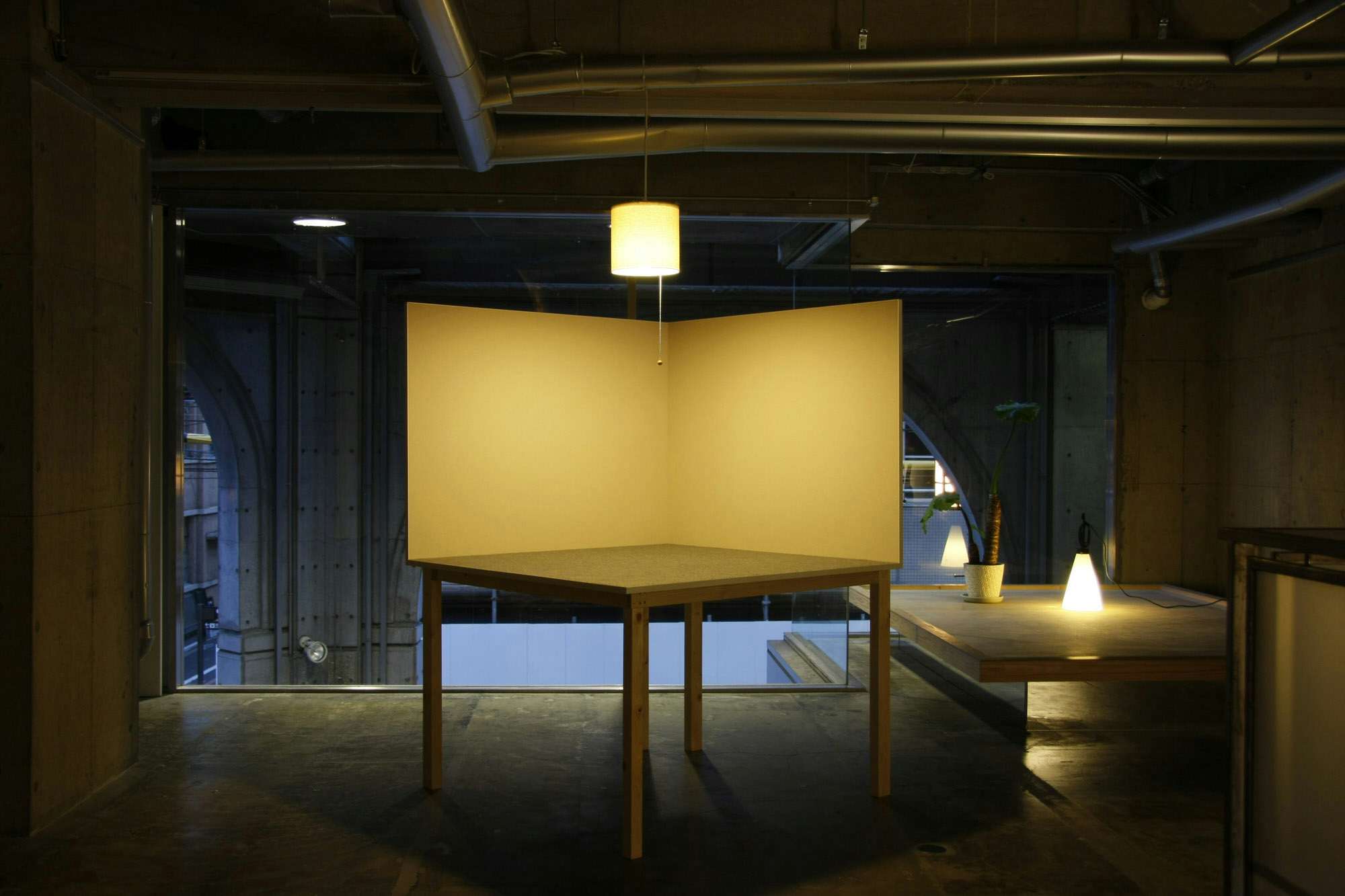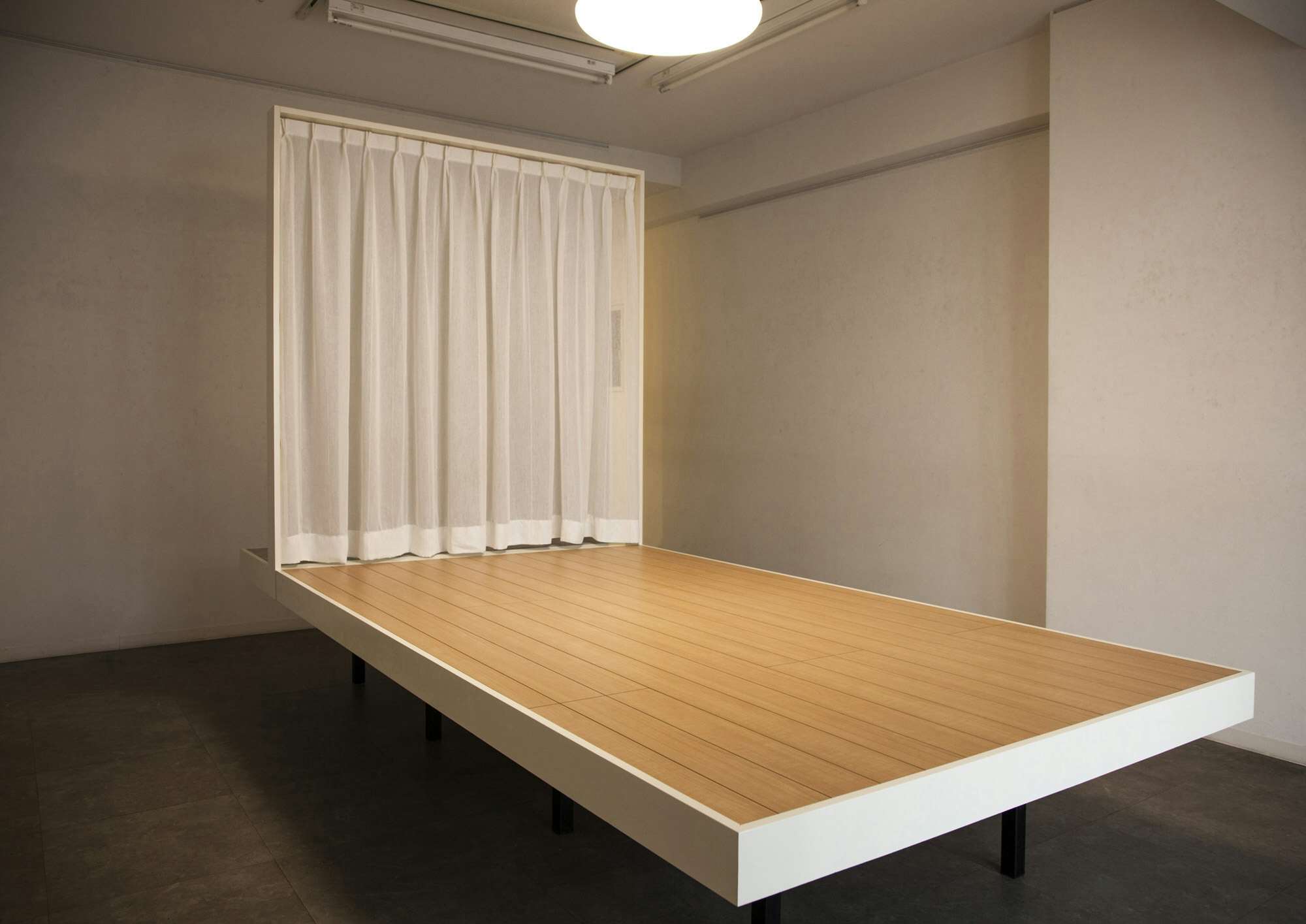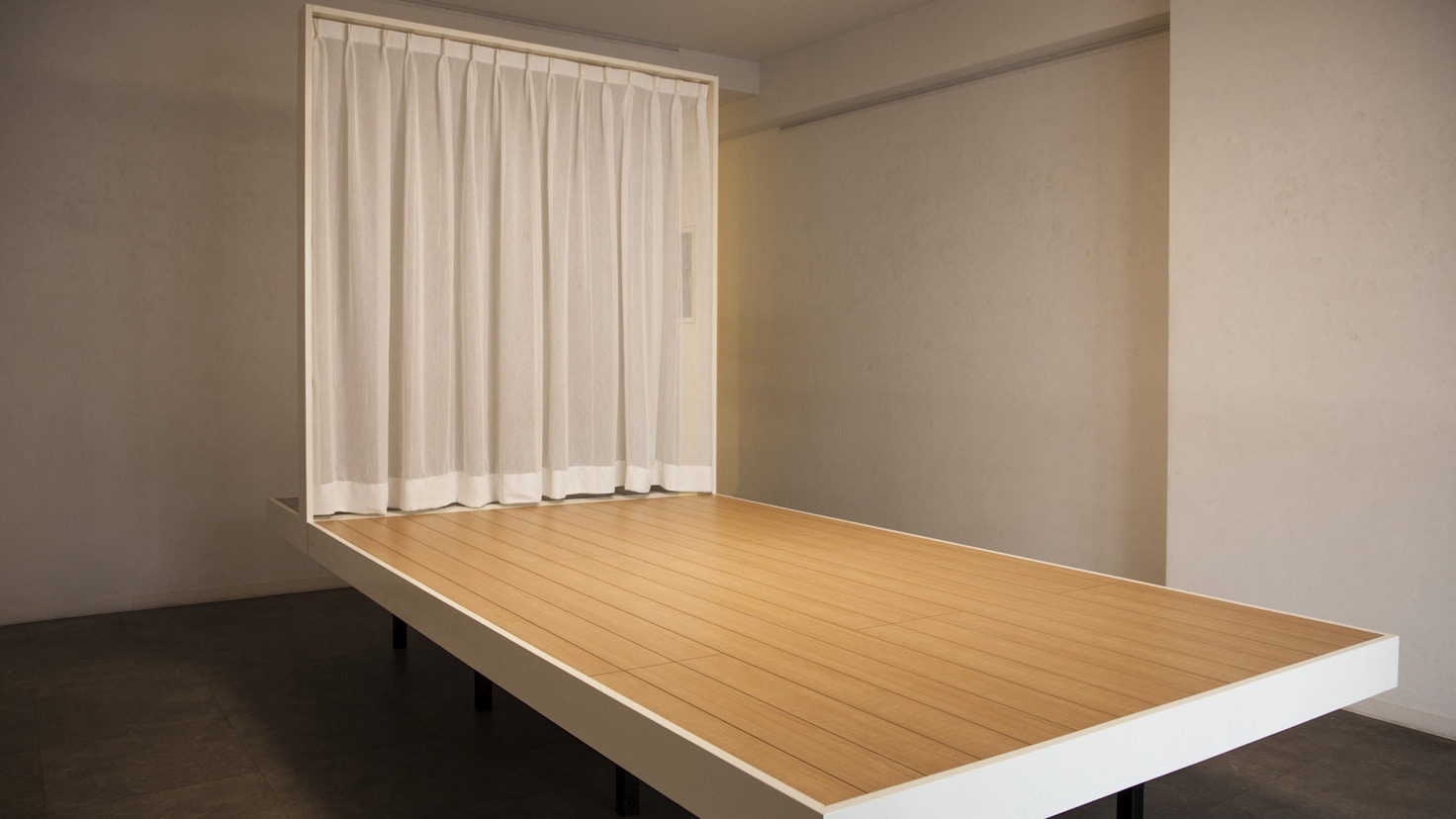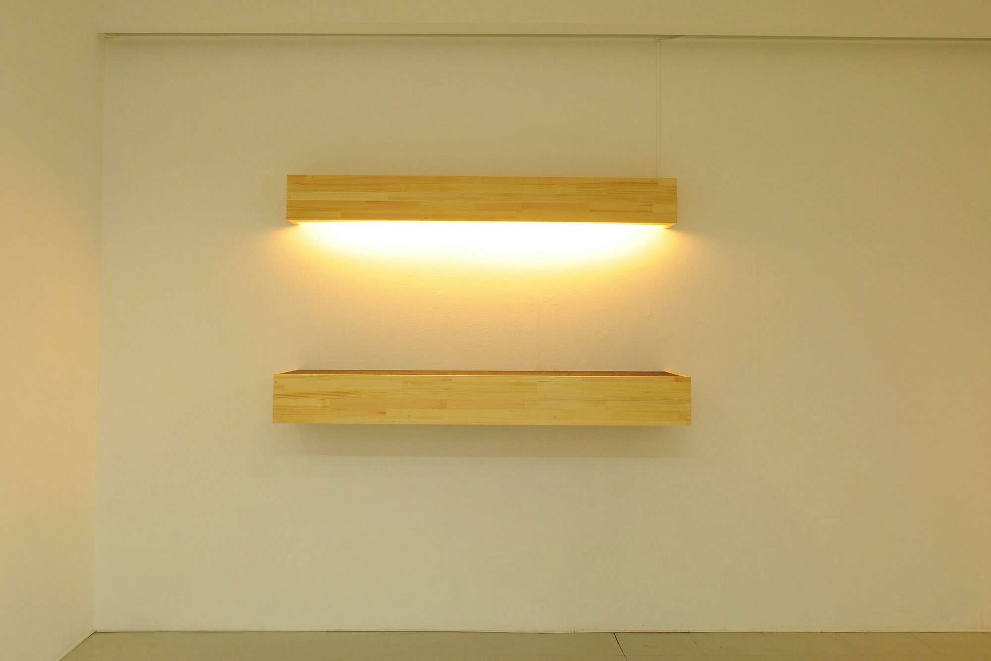 本展では、展示空間全体をひとつのモデルハウスに見立て、インスタレーション作品を展開。現代の日本の家に用いられるような木材を下地に、落ち着いた色味の壁紙と床材、温かい光を灯す照明器具を組み合わせた、立体的な造形物が現れる。