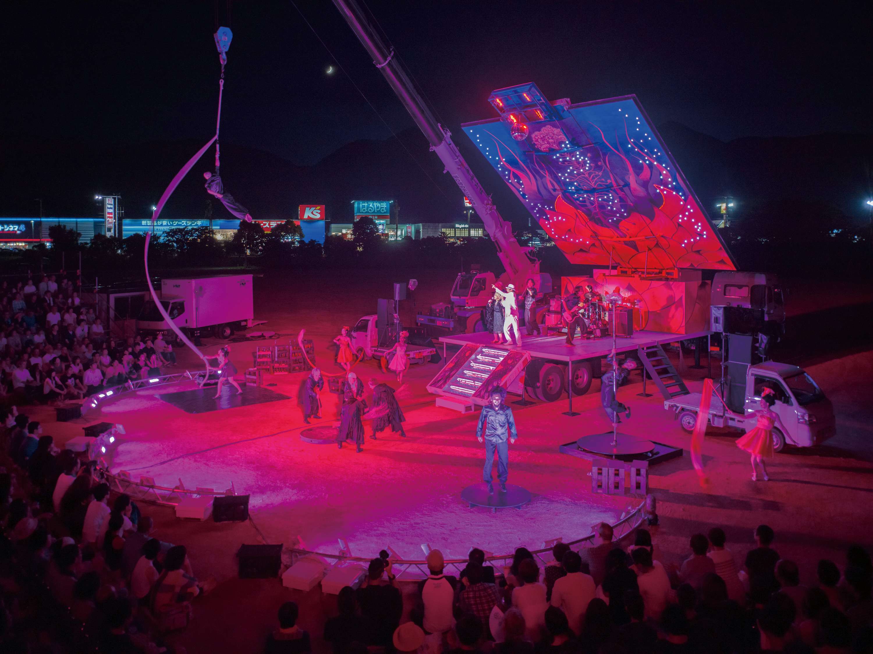 演劇の分野では、大正期の日本を舞台に新興芸術運動の胎動を描いた『1924』(三部作「Tokyo-Berlin」「海戦」「人間機械」) で話題を集めたほか、16年より台湾製のトレーラー車をステージの母体に、日本各地を巡礼する野外劇『日輪の翼』(原作=中上健次)で大きな感動を与えた。