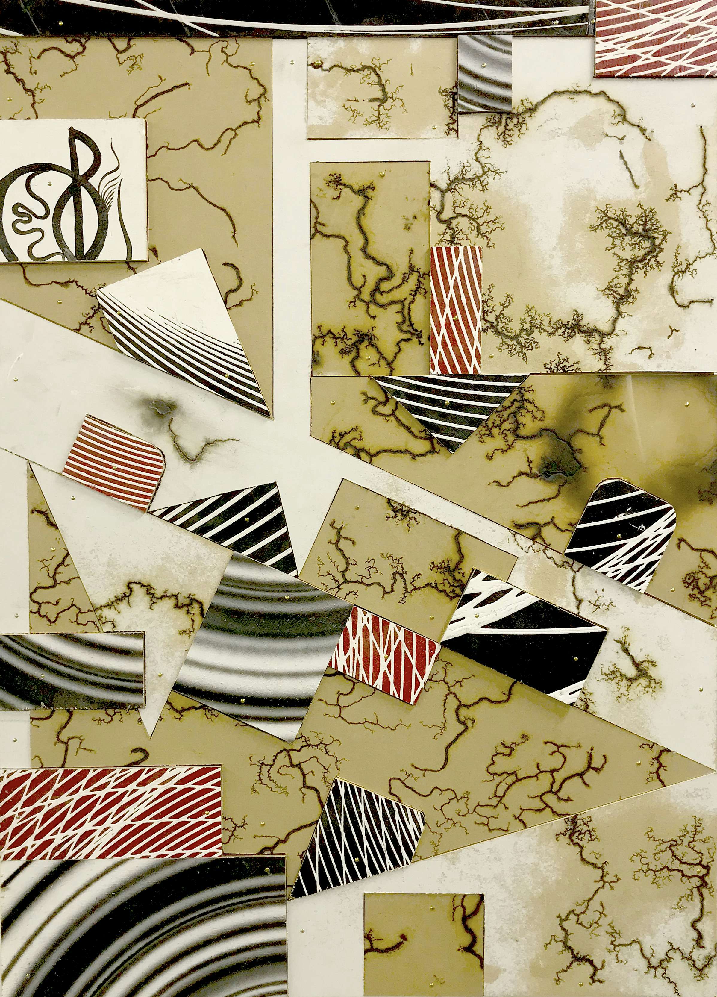 「観測・収集する行為」として自身の絵画制作をとらえる松下。近年は、高電圧電流が残した焼け跡や振り子の軌道で描いた曲線、絵具のひび割れなど様々な現象やシステムが生み出す「動きの痕跡」をコラージュした作品を手がけている。