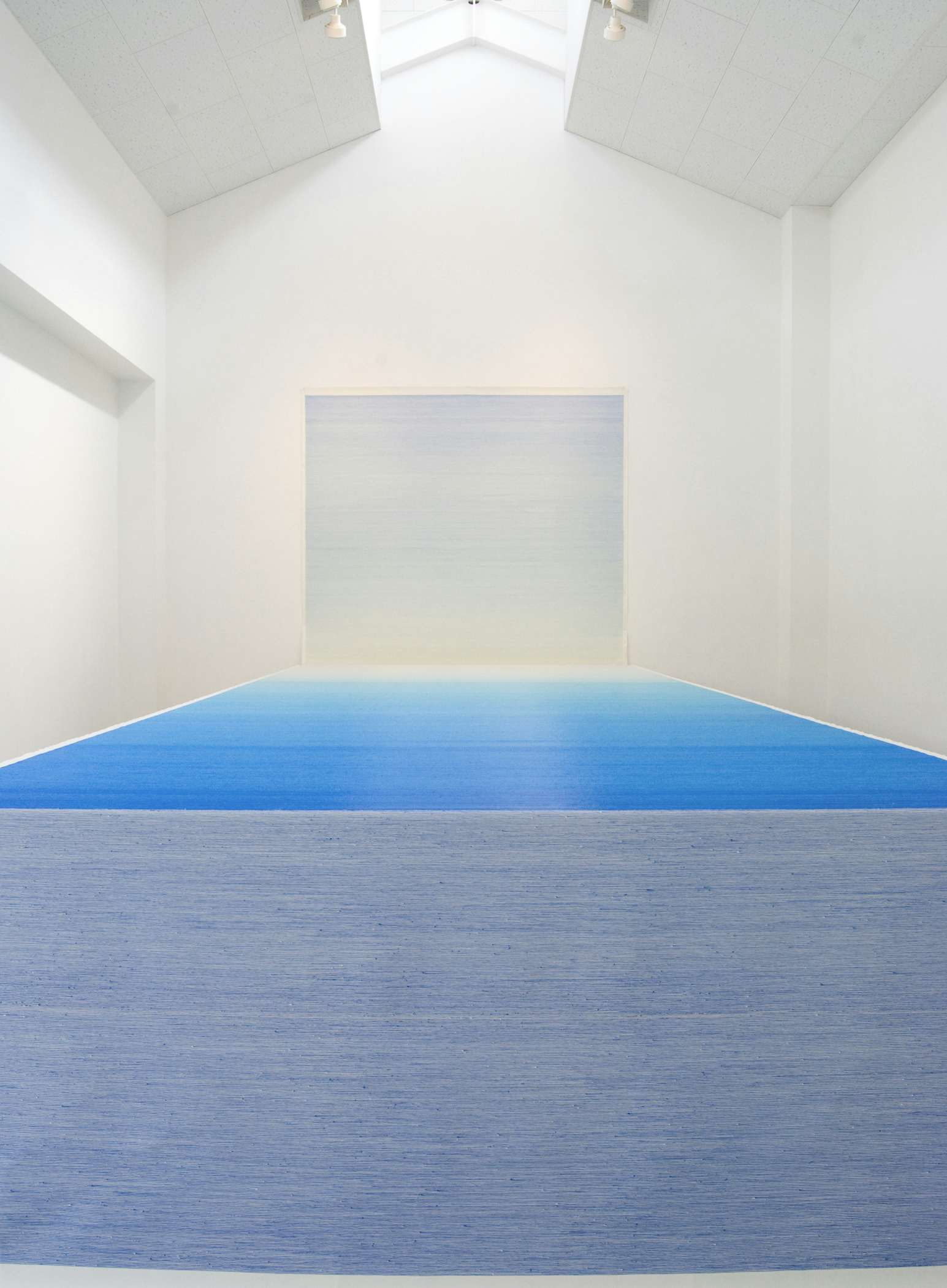 石川は1974年岩手県生まれ、99年岩手大学大学院教育学研究科修了。絵具の色合いを少しずつ変化させ、何本も線を引くことによって大気を表現している。緻密な作業の積み重ねによる青色のグラデーションは果てしなく広がる空や海を、また虹色のスペクトルは移ろう光を連想させる。